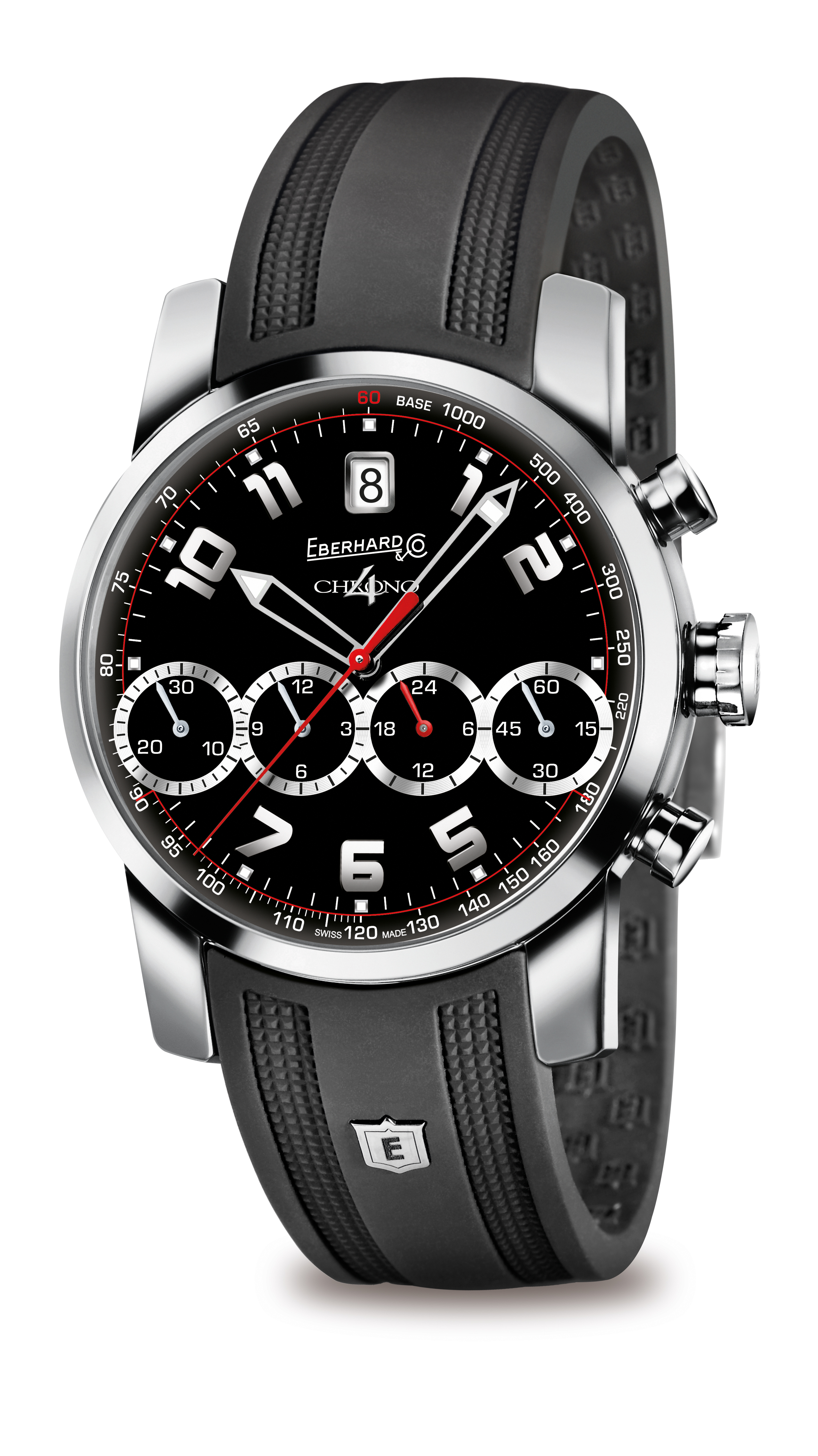 La lettura della cronografia in linea è tuttora un traguardo ineguagliato, il movimento Calibro EB. 200 12 ½” su base ETA 2894-2 a carica automatica ha un dispositivo Eberhard&Co brevettato per minuti e ore cronografiche, 24 ore e piccoli secondi; la sua complessità viene messa inevidenza da una semplice cifra, quella dei rubini che sono 54. Sotto il profilo estetico oltre ai due colori base indulge anche a un tocco di rosso. I quattro contatori in linea sul quadrante nero sono inseriti in un contorno bianco o argenté che sembra nascere da un’unica linea grafica; su quello bianco i contatori bianchi hanno un contorno nero lavorato “azurée”; i dieci “plots” scavati che segnano il quinto minuto, hanno un materiale luminescente nero su bianco e viceversa. Il cinturino in caucciù con la E in uno scudo oppure in alligatore ha la fibbia personalizzata.