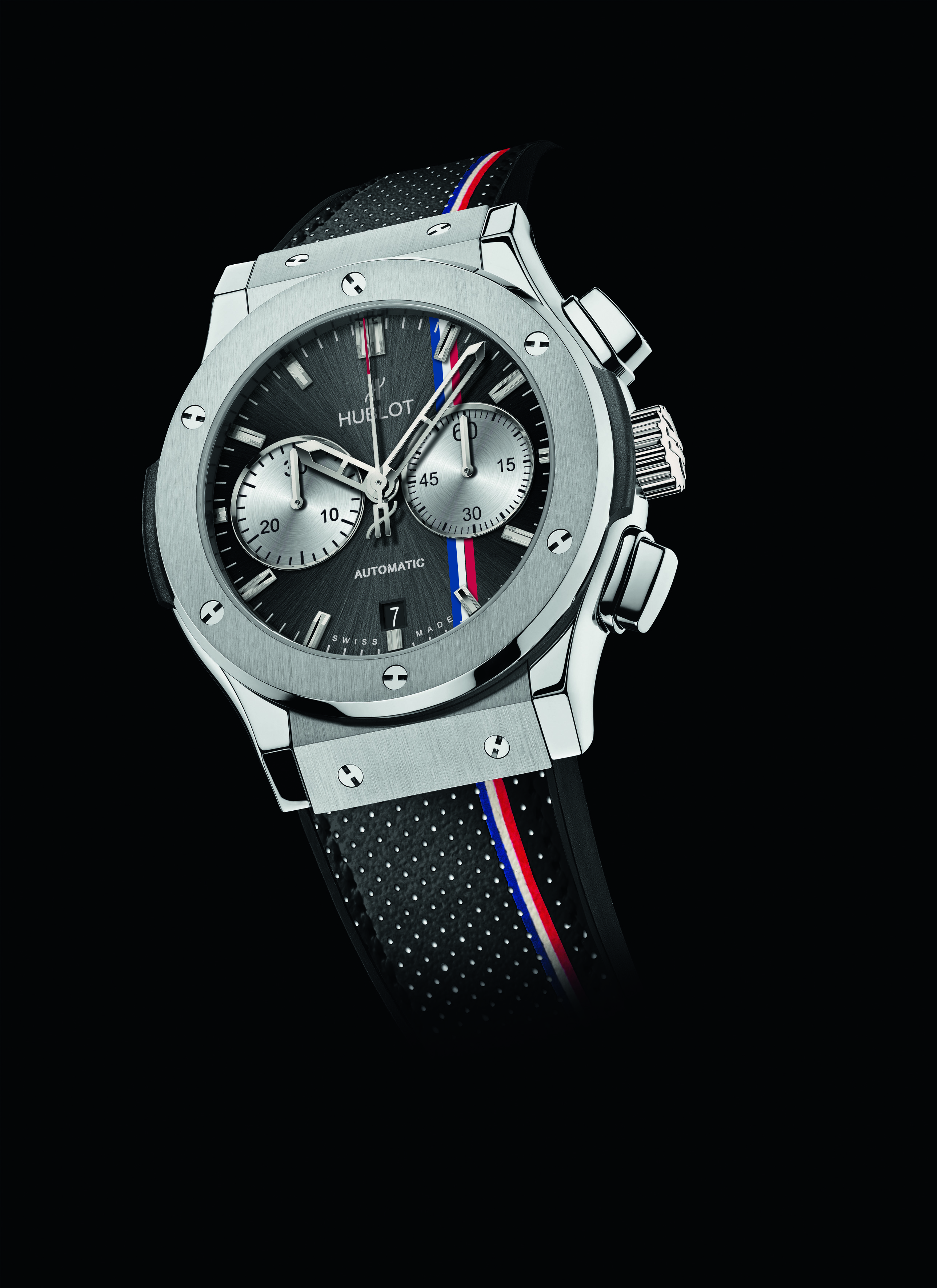 Sul quadrante nero guilloché soleil, spiccano i tre colori della bandiera francese; anche il cinturino in vitello traforato nero su caucciù ricorda la Francia nei dettagli cromatici.