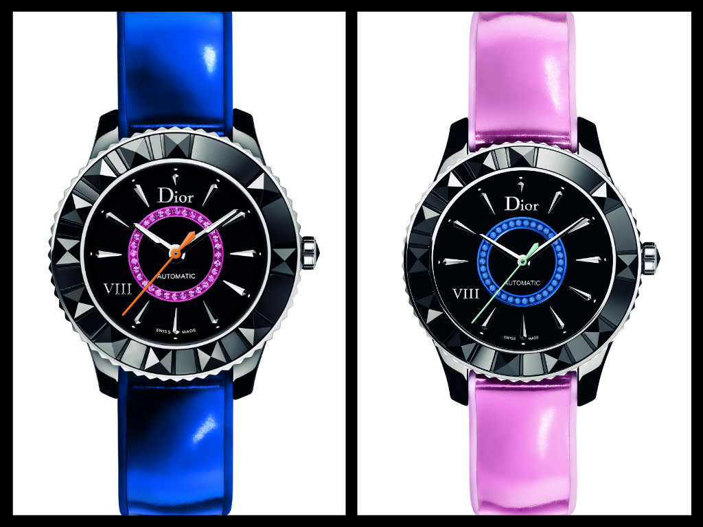 Sportivi i Black Ceramic con la cassa ø 38 mm in acciaio e ceramica high-tech e lunetta girevole con le piramidi tipiche della collezione Dior VIII; cinturino in pelle trattata con finitura metallica o bracciale in ceramica high-tech. Quadrante laccato con zona centrale in alluminio e pietre preziose. Nel movimento automatico la massa oscillante è laccata in colori tenui.