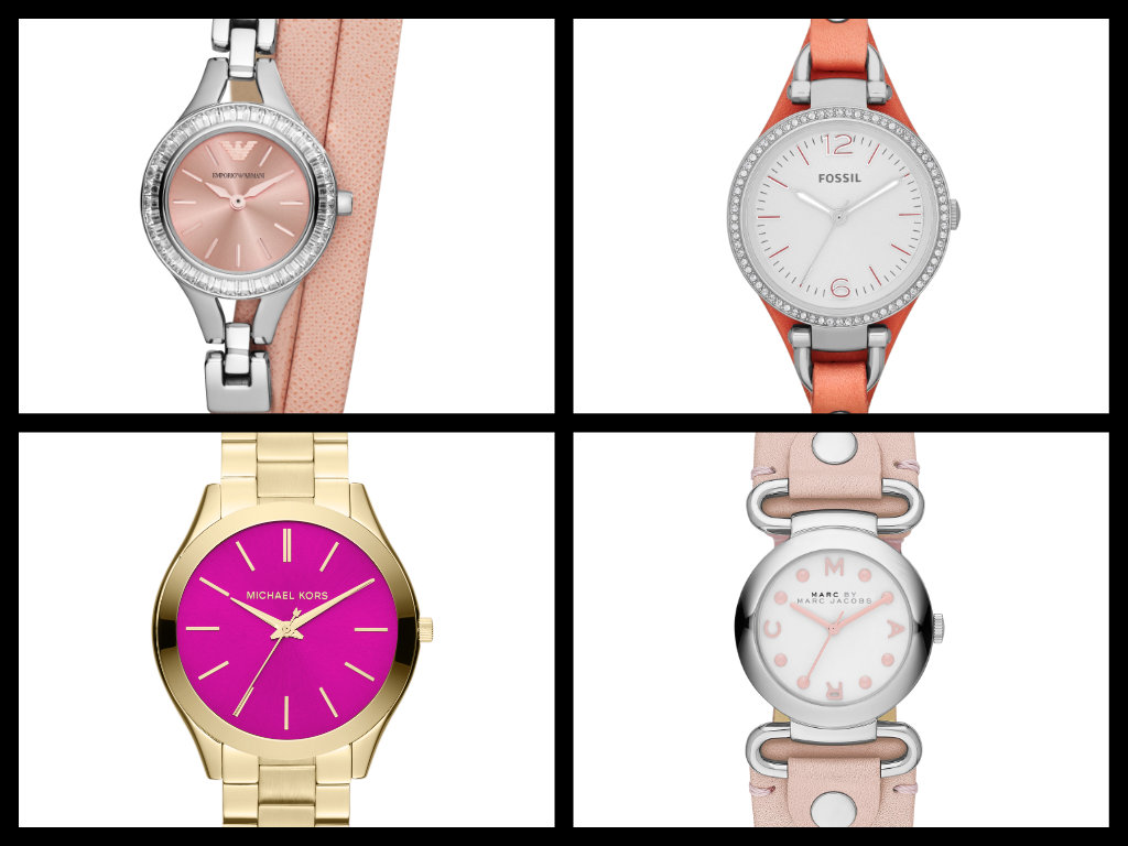 Ancora fashion con quattro modelli scelti nelle collezioni primaverili del Gruppo Fossil. Marc by Marc Jacobs, Emporio Armani e Fossil hanno puntato su colori tenui come il rosa cipria o un rosso-arancio dotati di originali cinturini, mentre l’orologio di Michael Kors ha un vistoso quadrante lampone.