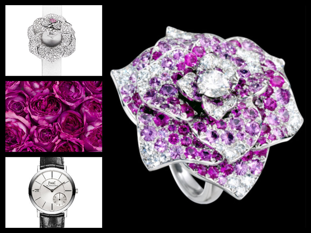 Torniamo a parlare di Piaget perché visto che il filo conduttore sono le rose, non si può dimenticare che nel 1982 una rosa è stata dedicata a Yves Piaget e da allora porta il suo nome. Recentemente intorno al tema di un roseto è nata una bella collezione non solo di orologi-gioiello (anche segreti, sotto i petali del modello in oro che incastona diamanti per quasi 8 carati, si nasconde il segnatempo al quarzo) ma soprattutto di gioielli e, facendo un’eccezione alla filosofia di soloPolso, al posto d’onore c’è un anello che riproduce una rosa preziosissima. Terzo elemento fotografico un orologio da uomo, l’Altiplano in oro bianco, automatico sottile ed elegante: da sognare per chi non può permetterselo.