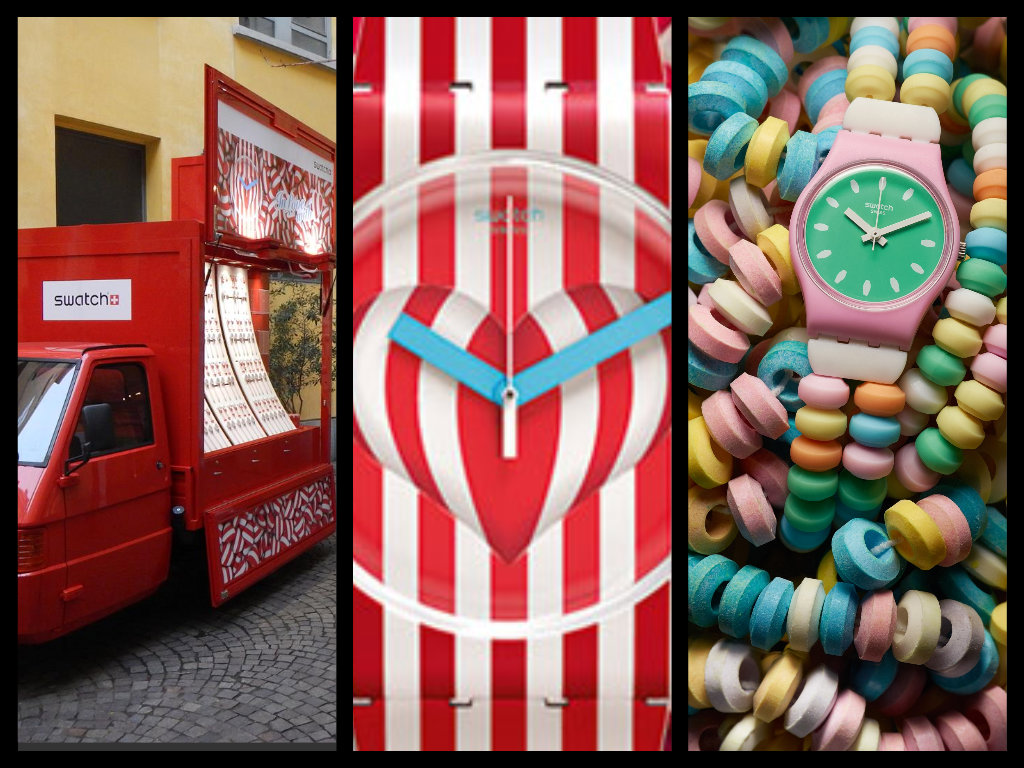 Per finire in dolcezza ecco Swatch, sia nel modello per San Valentino, custodito in una rossa scatolina cilindrica come le più dolci caramelle. Le strisce bianche e rosse, che sul quadrante formano un cuore e proseguono poi sul cinturino, sembrano proprio le componenti dei tradizionali bastoncini di zucchero. A chiudere uno Swatch della collezione di primavera che si riallaccia ai colori del mazzo di rose in apertura. Anche qui dolcezza in primo piano, indicata soprttutto per giovanissime romantiche.