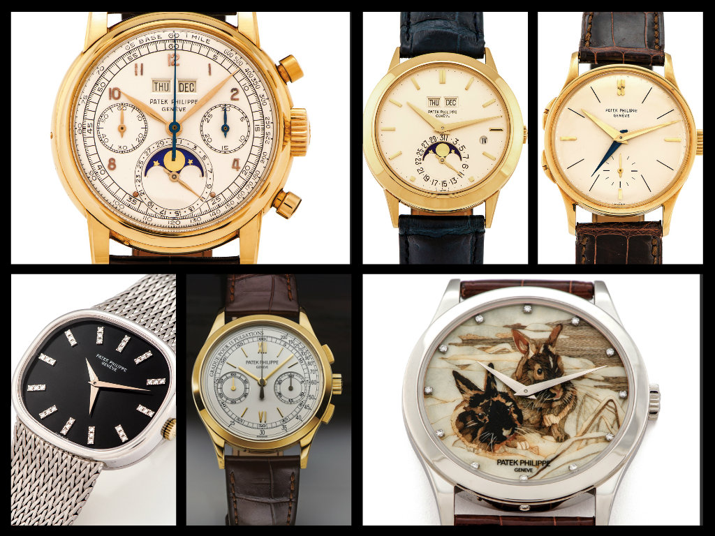 Patek Philippe Ref 2499 Top Lot dell’asta $867.750; Ref.3450; Ref.2697; sotto Ref.3619; Ref 5170 e il Ref.5077in platino e marquetterie