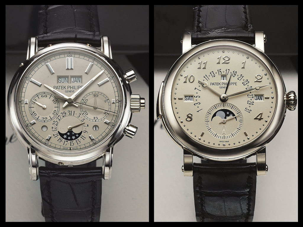 Patek PhilIppe: Nautilus Ref.5712 in acciaio 2008 fasi luna e riserva di carica, squelette Ref.3878 automatico, Ref.5396 Calendario annuale oro bianco 2010: Ref.5960 Cronografo Calendario annuale platino; Ref.5004 cronografo rattrappante Q.P. 2009 in platino