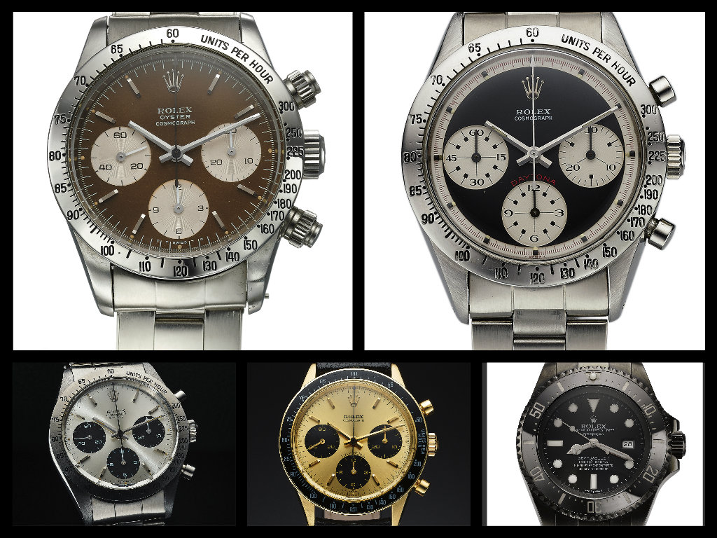 Erano in asta 32 Rolex, sei con lotti susseguenti hanno visto dei Top Lot con un Cosmograph ref 6239 in acciaio Paul Newman del 1964 $ 87.500 e $ 87.500 per un Cosmograph del ’78 quadrante Tropical Ref 6263; $ 81.650 per un Daytona in oro Ref 6264; $ 23750 per un pre-Daytona del ’65 in acciaio con quadrante in argento brunito; $ 26.250 per un Daytona in acciaio del ’67, mentre un Explorer Tropical del ’64 stimato 2.200/3.200 è andato a $ 4.000; un Submariner in oro quadrante blu, sub a 300 m. del 2010 è arrivato a $ 27.500 (stima max 30.000) ed è stato pagato $ 8750 un DeepSea Dweller del 2008.