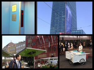 Dal 30°… al 30° (!) piano della Tower ostaggi dell’ascensore; la Marketplatz con l’edificio rosso del municipio; acqua fresca