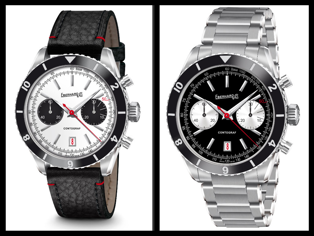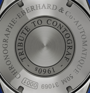 Il primo Contograf, con due contatori, aveva pulsanti impermeabili, datario alle 6 con scatto rapido della data e nel contatore dei minuti era indicato il tempo delle telefonate tramite centralino (prima di pagare un supplemento). Il “nipote”, cassa in acciaio ø 42 mm, ha mantenuto la forma della finestrella e il fondello a vite, oggi con l’incisione “Tribute to Contograf 60s”. La scala tachimetrica accentua la sportività del modello, la lunetta girevole unidirezionale in ceramica lo rende di grande attualità. Bracciale Chassis (a richiesta con la chiusura Déclic brevettata) o cinturino in pelle con dettagli rossi. Infine last but not least il movimento è il Calibro automatico su base ETA 7750.