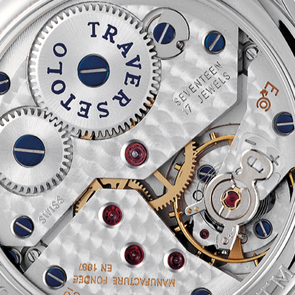 Il Traversetolo a carica manuale, cassa in acciaio ø 43 mm, movimento Calibro ETA 6498 (nella foto a lato dal fondello in vetro zaffiro si vede il nome del modello) è realizzato in due referenze: 21016 con fondo in vetro zaffiro e 21020 con fondo impresso a conio e scritte in rilievo. Il quadrante è bianco per la versione con cinturino, nero per quella con bracciale Chaland.