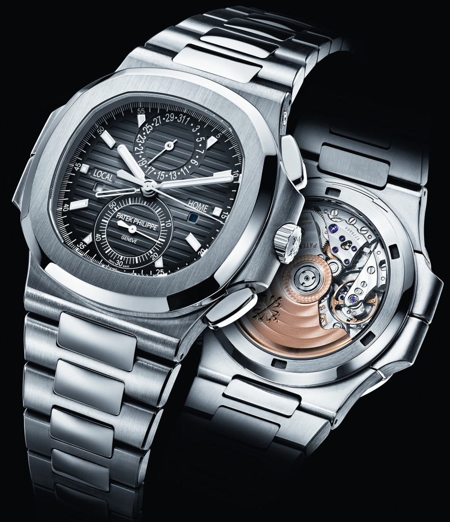 A parte il nuovo Calibro CH 28520 S C FUS (cronografo automatico integrato con ruota a colonne, innesto a dischi, rotore centrale unidirezionale in oro 21 carati, 370 componenti, 34 rubini, A/h 28.800), è il quadrante in ottone nero sfumato con indici e lancette in oro bianco, a mostrare grandi modifiche. La data adesso è analogica, il contatore alle 6 un totalizzatore di 60′. Sono stati necessari altri 47 componenti, ma lo spessore del movimento è aumentato solo di 0,3 mm grazie anche alla spirale Spiromax® (brevetto Patek Philippe) in Silinvar®. Dal 2014 il cronografo Nautilus Ref.5980 in acciaio con bracciale, esce di produzione; è il caso di dire: il Re è morto viva il Re?