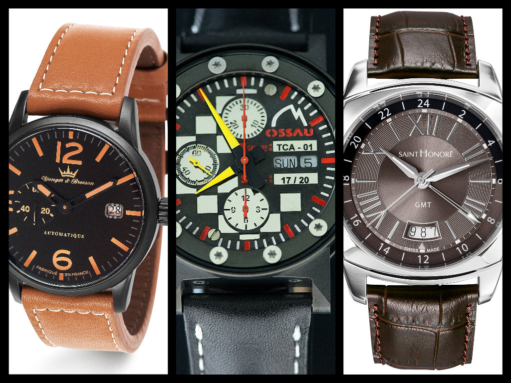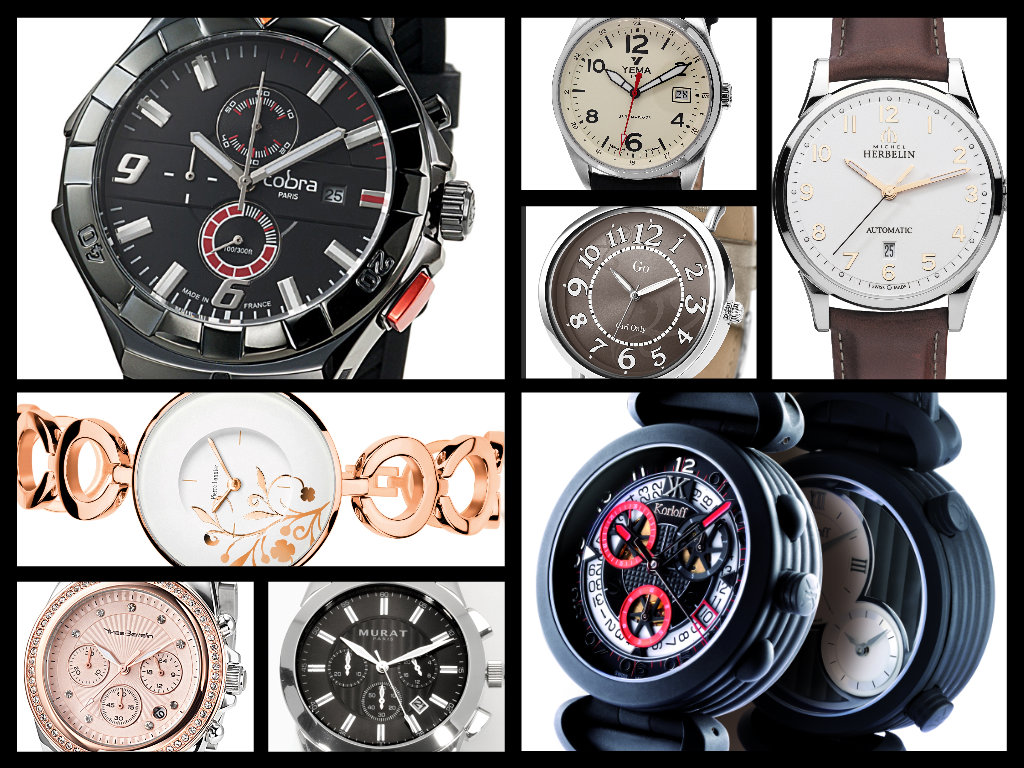 In alto Cobra cronografo, automatico Yema, Harmony di Go Girls only, automatico Michel Herbelin; in basso femminili Pierre Lannier e Yves Bertelin, cronografo Murat watch e reversibile Voyageur Korloff watch