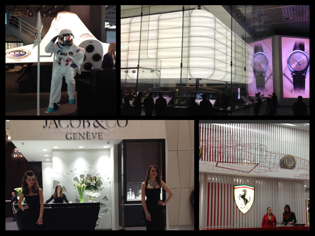 Una bella ragazza ingioiellata e in abito da sera è un’attrazione, e se sono due, come quelle di Jacob&Co, tanto meglio, peccato non fosse in primo piano anche l’Astronomia Tourbillon. Altra calamita il Cavallino rampante che spicca sulla sagoma di una Ferrari, solo schematizzata. In formato ridotto e in cartapesta un altro cavallo quello di Longines, da sempre sponsor degli sport equestri. Come l’anno scorso, da Luminox, immaginiamo di andare sulla luna con un astronauta. Infine ancora una foto dello Stand di Patek Philippe, questa volta completato con le grandi immagini dei modelli più importanti e complicati, proiettati incessantemente.