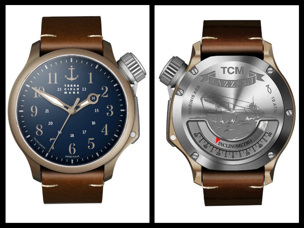 Nelle foto sopra il TCM dedicato al famoso sommergibile Tazzoli e al suo comandante, chiamato “il Corsaro dell’Atlantico”; la cassa è in bronzo marino, sul retro la sagoma del Tazzoli e l’inclinometro espresso in gradi. Il cronografo Montecristo di Locman è equipaggiato con il Calibro SIO/DPch88, un movimento automatico realizzato da SIO in Italia in partnership con DePa Swiss Movements.