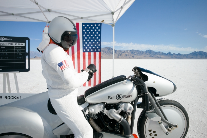 Negli anni ’30 l’auto di Campbell, Napier Railton Blu Bird, superò i 484 Km/h;al suo fianco c’era Rolex; Su un altro Blue, il Blue Flame, nel 1970 furono superati i mille Km/h. Per le due ruote nel 2010 furono superati da Rocky Robinson 600 Km/h mentre nel 2011 con un mezzo non tutto carenato Richard Assen superò i 420 Km/h. Recentemente sulla motocicletta nata dalla collaborazione tra Shaw Speed Motorcycles, concessionaria ufficiale Harley Davidson in Inghilterra, e la Bell&Rosss che, con Bruno Belamich, aveva ideato il profilo aerodinamico della moto, sono stati raggiunti i 200 Km/h. La moto, nel persiero dei costruttori, non è stata ideata per i record, ma per offrire ai motociclisti che amano la velocità (sicuramente su pista e non su strada…) un mezzo adeguato, inoltre Bell&Ross ha anche realizzato per l’occasione, due orologi in tiratura limitata a 500 esemplari: il cronografo automatico BR01 B-Rocket e l’automatico BR03 B-Rocket con riserva di carica; entrambi ø mm 46, sub a 100 m. e con quadrante nero opaco.