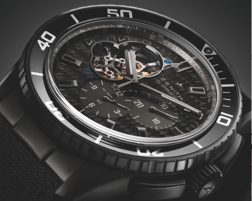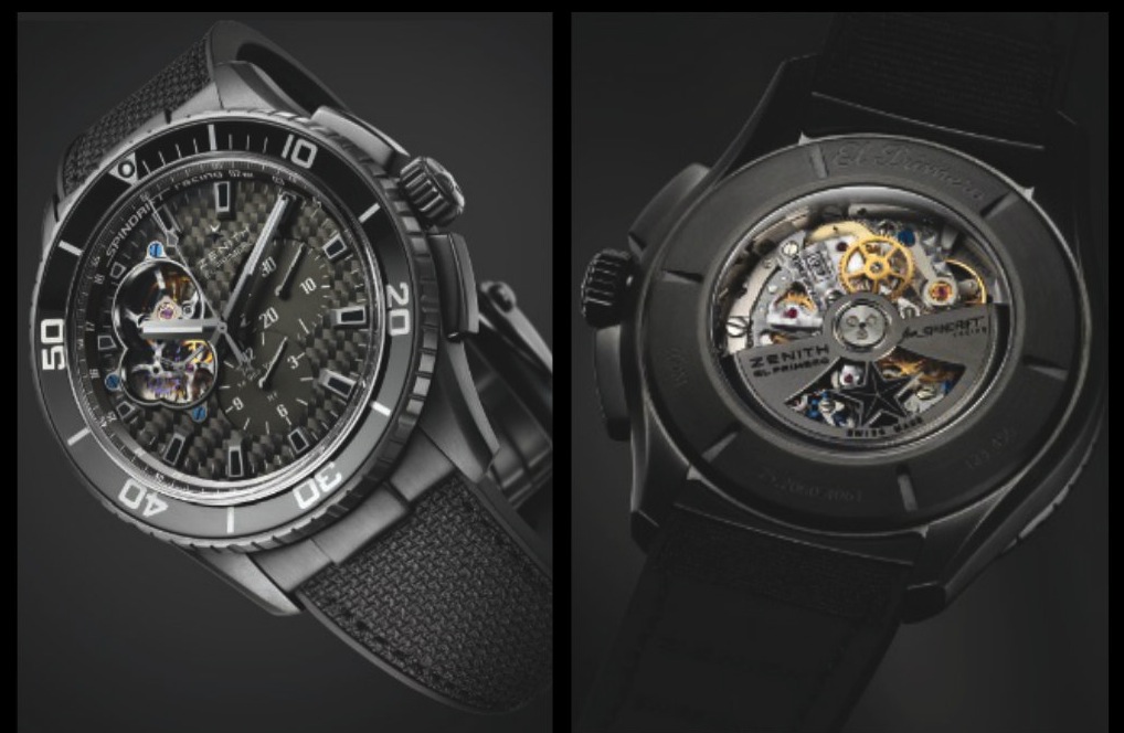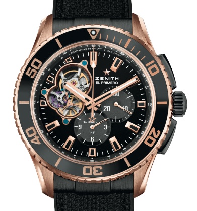 Il nuovo El Primero ha un look molto sportivo e a bordo del Maxi Trimarano classe TP52, che vola letteralmente sulle onde, si trova a suo agio, così come è accaduto nei secoli passati, quando i cronografi da tasca Zenith accompagnavano le esplorazioni più ardite. Può essere scelto nella versione acciaio DLC (quadrante in fibra di carbonio) o in titanio e oro rosa (quadrante nero), cassa ø 45 mm sub m.100; Calibro 4061, 262 componenti (alcuni in silicio), ruota a colonne; lunetta girevole e su quella interna scala telemetrica; quadrante con apertura sullo scappamento, alle 12 su un anello il nome, inciso anche sul rotore scheletrato.