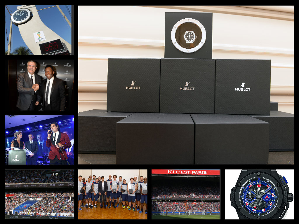 Però il mattatore resta Hublot, ne pubblichiamo una Photo Galery anche perché con i Mondiali alle porte, che lo vedono anche quest’anno Official Timekeeper, è quasi d’obbligo. Nella foto il podio Hublot, il grande orologio count-down, Pelè e Falcao; le quattro fotografie in basso sono dedicate all’Hublot più recente, dedicato al Paris St.Germain, il tempo indicato sugli spalti e i giocatori della squadra.