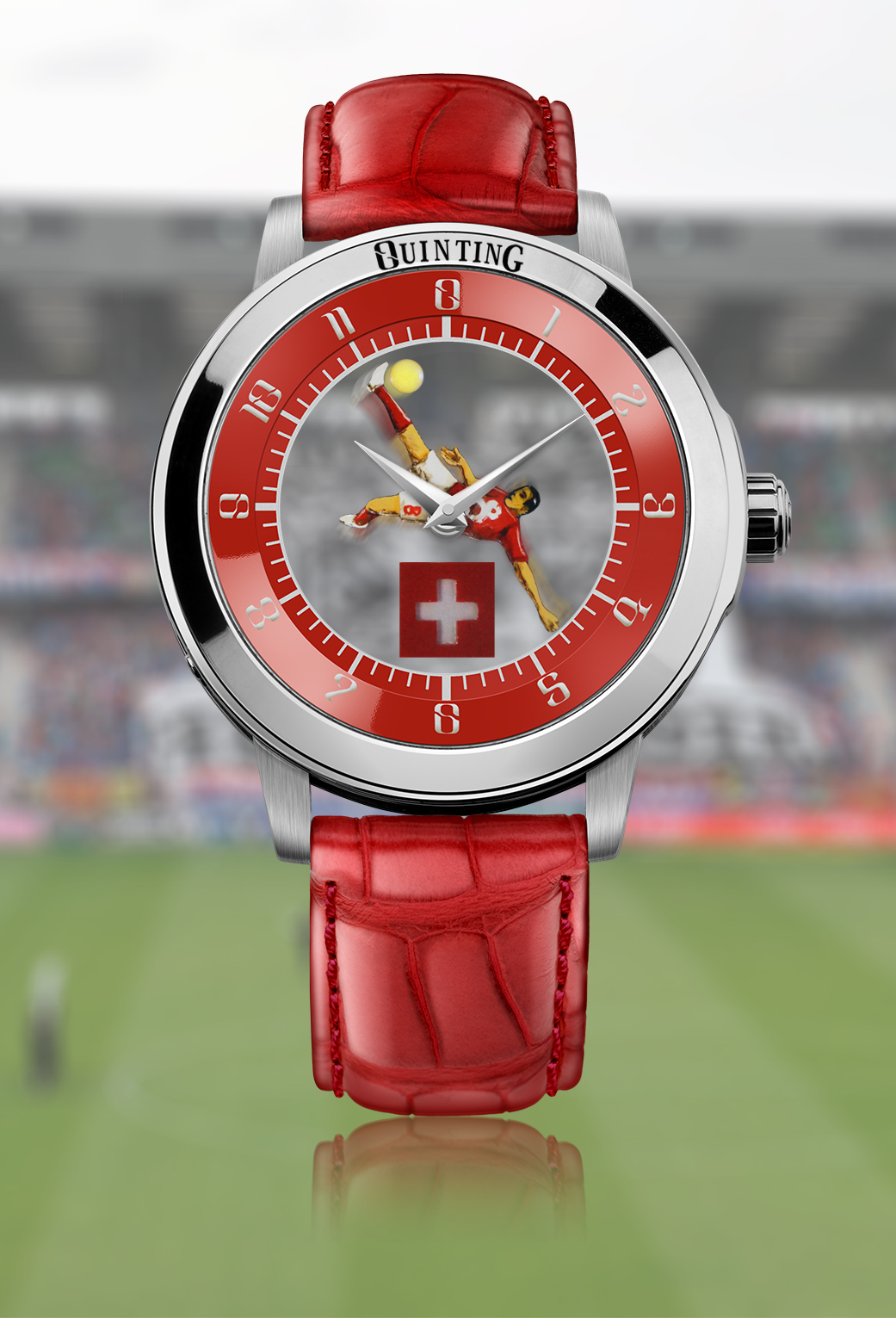 Vicino a questi nomi si è inserit0 da pochi giorni anche Quinting con uno dei suoi orologi ø 39 mm spessore 8,16 mm. del tipo misterioso, con 7 dischi in vetro zaffiro; lunetta e cinturino nel colore predominante della nazionale; sul quadrante dipinto con smalti la bandiera nazionale; la lancetta dei minuti è un giocatore in procinto di tirare in porta, il pallone luminescente si vede anche al buio e si muove a ogni ora facendo goal. Ideato per i primi undici Team ammessi e realizzato in undici esemplari con la numerazione dell’edizione e, visto il prezzo e la complessità del modello, è riservato a facoltosi appassionati collezionisti.