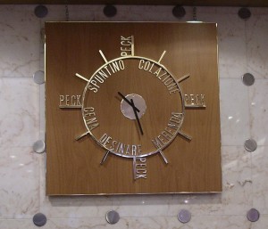 Probabilmente non tutti i gourmand conoscono l’orologio che da molti anni è in uno dei templi della gastronomia milanese: Peck, in via Spadari. L’abbiamo visto quando abbiamo raccontato come Peck avesse preparato il pranzo per la visita di Papa Ratzinger a Milano (bello anche ricordare che, pur essendo domenica, il personale aveva lavorato gratuitamente). Ma torniamo all’orologio per raccontarne il quadrante in legno, che ai 4 punti cardinali ha il marchio, indici geometrici esterni e all’interno scritte invitanti (all’epoca non c’era ancora l’invasione della lingua inglese): colazione, merenda, desinare, cena, spuntino.