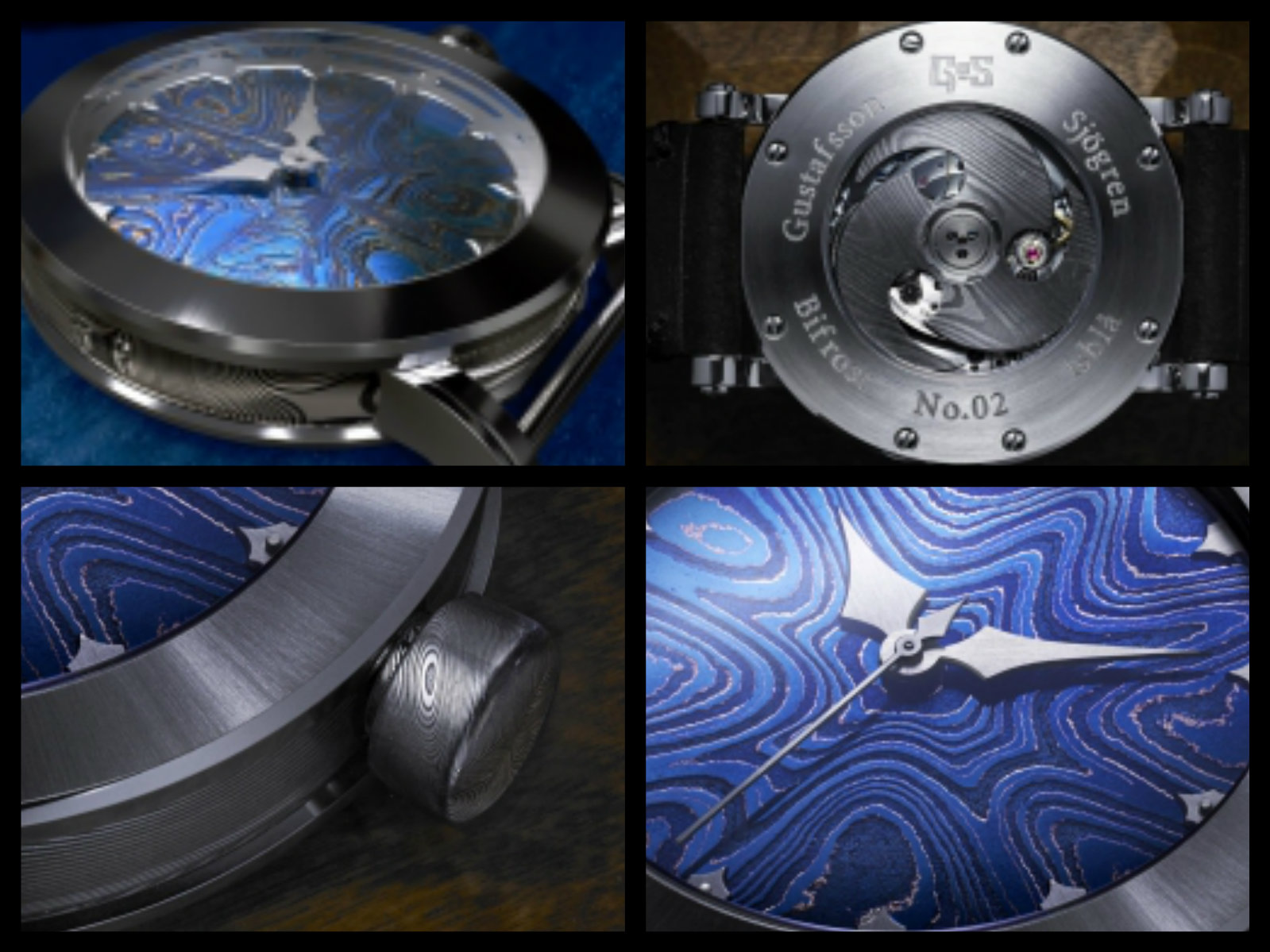 Dei due svedesi ci avevano parlato a Baselworld. Smaltita, o meglio ridotta la mole delle novità viste in marzo, eccoci al Damascus Steel dei GoS. Una lavorazione mediorientale, che ha coinvolto in passato anche la Svezia e che ci ha fatto pensare anche al niello, entrambe antiche tecniche per impreziosire oggetti in metallo. Non solo le casse (realizzate in Germania con acciaio GoS) ma anche i quadranti e le corone di questi modelli sono lavorati con questa tecnica artigianale, che alterna le incisioni creando diversi riflessi; sono incisi anche i movimenti e i ponti. Cinturini svizzeri in pelle e custodie realizzate da un artigiano svedese. Edizioni limitate a 5/25 esemplari.