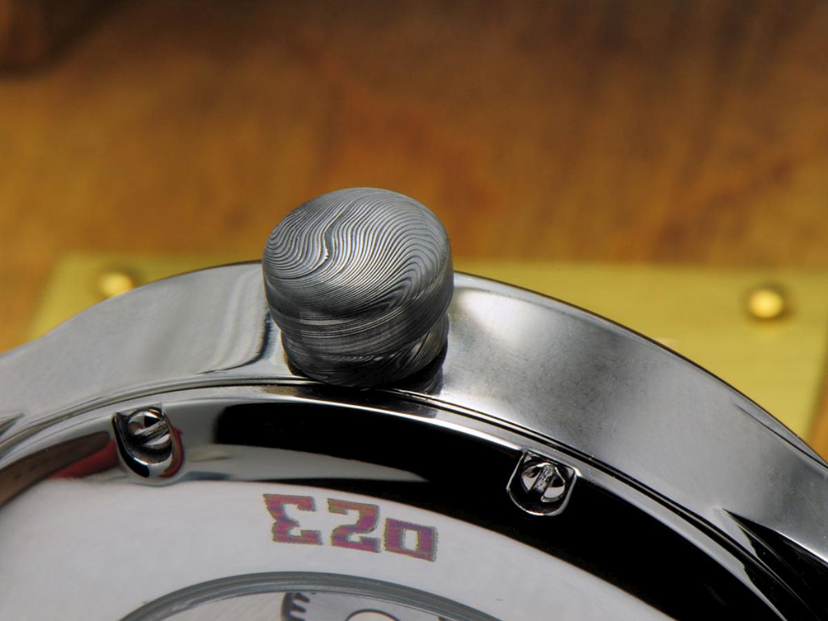 Negli ultimi anni il fascino degli orologi ha fato nascere interessanti realtà artigianali; in Germania Grieb&Benzinger, in Svezia Johan Gufstasson (esperto di coltelli e spade) e l’orologiaio Patrick Sjorgen, che hanno iniziato a lavorare insieme nel 2007. Erano a Baselworld 2014 e ne presentiamo la lavorazione Damascus Steel (nella foto la corona incisa). Thanks to watches’ passion there are new interesting small independent Brands; in Germany Grieb&Benzinger, in Sweden Gustafsson and Sjogren who began working together in 2007 in Linköping. They were in Baselworld and we publish their Damascus Steel, a Metier d’art for GoS watches, with engraved cases, dials and crowns (picture on the left).
