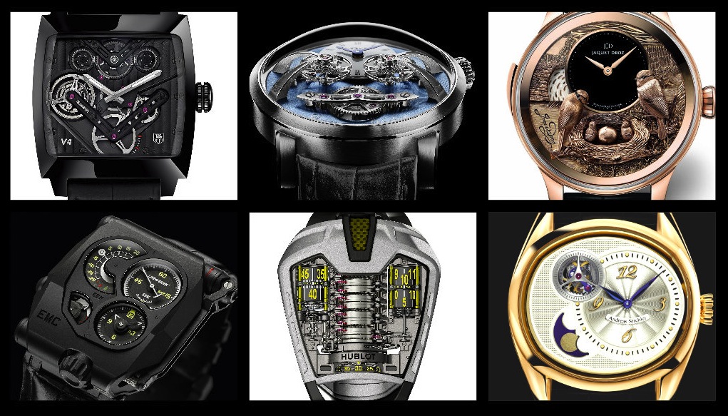 EXCEPTION MECHANIQUE: TAG Heuer Monaco V4 T.; MB&F Legacy Machine N°2; Jaquet Droz The Bird Repeater; Urwerk EMC; Hublot MP-05 La Ferrari 50 days power reserve; Andreas Strehler Sauterelle à la lune perpetuelle