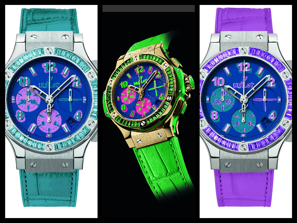 Le novità in sintesi: Hublot Jeans blu notte maschile (cassa ø 44, solo 250 gli esemplari). Spirit of Big Bang, viene voglia di paragonarlo a un abito grigio fumo di Londra; per la prima volta un Hublot in cassa tonneau, mm 45×51 in titanio, ceramica e King Gold, con movimento El Primero 36.000 A/h, rielaborato dai due Marchi. Per arrivare al cronografo automatico Big Bang Pop Art for Ladies, con i colori della primavera, cassa ø 41 mm (ma non è troppo grande?) realizzato in 200 esemplari per ogni versione.