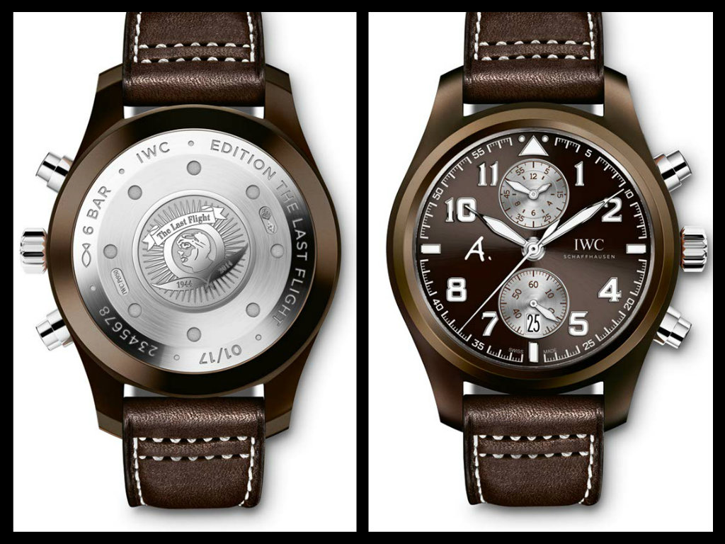 Il Lockheed P-38 Lightning decollò il 31 luglio 1944 e fu abbattuto da un aereo tedesco. Solo nel 1998 vennero ritrovati nel mare di Marsiglia il braccialetto del pilota e i relitti dell’aereo. Per la prima volta la cassa è realizzata in nitrito di silicio, una ceramica opaca ad alte prestazioni, marrone come il quadrante (il colore della tuta indossata dal pilota); corona, pulsanti e fondello sono invece in p latino (17 esemplari), oro rosso (170 esemplari) e titanio (1700 esemplari). Il movimento è il Calibro automatico 89361 automatico. Sul fondello un’incisione commemorativa. La custodia in pelle è decorata con un medaglione e contiene un tagliacarte a forma di rotore, per le due edizioni in metallo prezioso IWC ha aggiunto una stampa in duralluminio e cornice in pelle dell’artista Manolo Chretien. Gli esemplari in platino saranno battuti all’asta entro la fine dell’anno da Sotheby’s a Ginevra e l’intero ricavato sarà devoluto alla Antoine de-Exupéry San Youth Foundation.