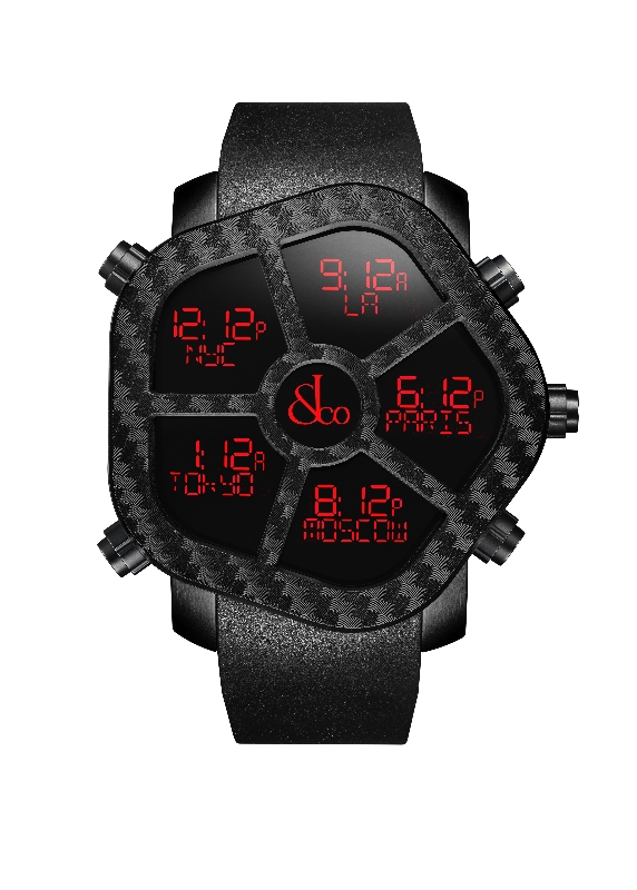 L’originale cassa pentagonale ø 47 mm è in acciaio trattato PVD black micropallinato, fondello personalizzato con il logo della Marca, lunetta in fibre di carboni e caucciù. Il movimento al quarzo è il Calibro Swiss Made JCDQ01 (32,768Hz; 20 ppm, batteria al Lithium che può essere anche ricaricata da cavo USB); ha un quadrante esclusivo digitale LCD nei colori rosso, arancio giallo, verde, blu, porpora, bianco, dove vedere le Ore del mondo in 20 città preselezionate, il tempo locale di una città, giorno e notte, data, anno del quadriennio.