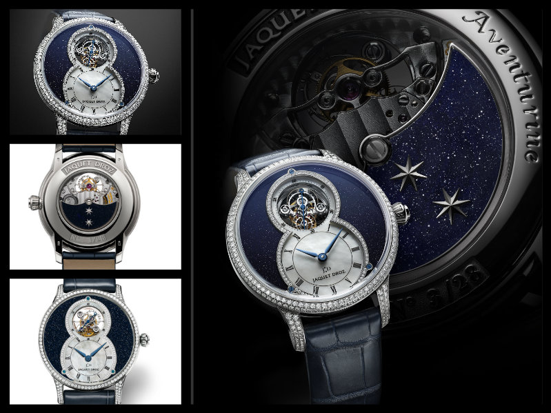 Il Grande Seconde Tourbillon Aventurine ha la cassa in oro bianco, ø 39 mm, che risplende per i 260 diamanti. Il movimento con scappamento a tourbillon a ore 12, è il Calibro 25JD a carica automatica con bariletto semplice, massa oscillante in oro bianco, 21.600 A/h, 31 rubini e sette giorni di carica. Il quadrante blu in avventurina sembra un cielo profondo sul quale spiccano l’indicazione delle ore su madreperla bianca e 90 diamanti; complessivamente i diamanti taglio brillante su questo segnatempo di alta gioielleria, sono 382. Per la prima volta sulla massa oscillante un frammento di avventurina accoglie due stelle, preziosa firma della Maison.
