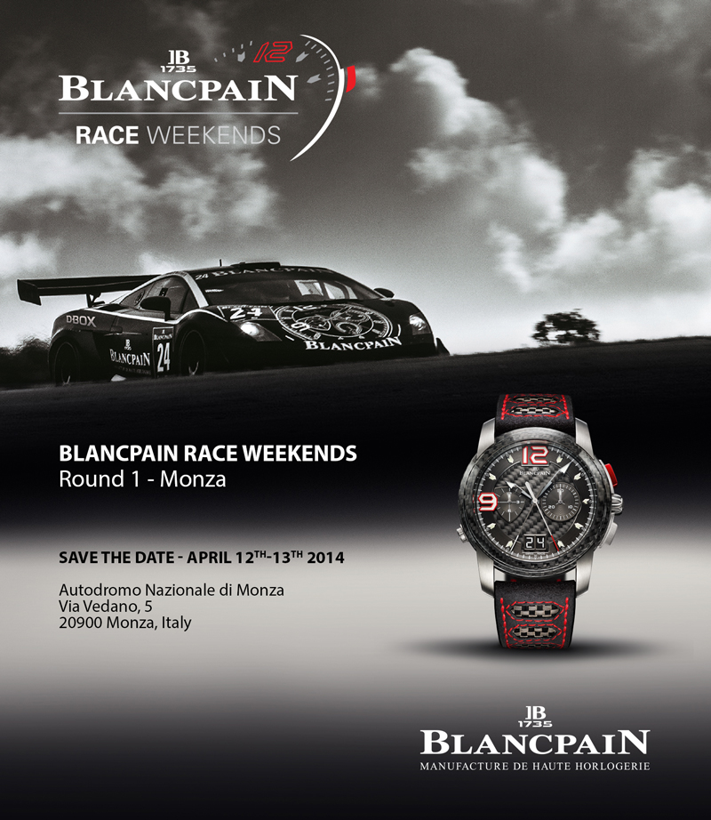 Blancpain_SaveTheDate_Monza2014L’autodromo di Monza ospita il 12 e 13 aprile la prima tappa del Lamborghini Blancpain Supertrofeo,  che ormai da diversi anni riunisce appassionati dei motori e degli orologi in un lungo calendario in giro per il mondo. La tre giorni monzese (il venerdì ci sono prove e verifiche) comprende anche le Blancpain GT Series e gare di Formula Renault 3,5. Per tutti c’è il silenzio obbligatorio dopo le 20 e sino alle 8.00…