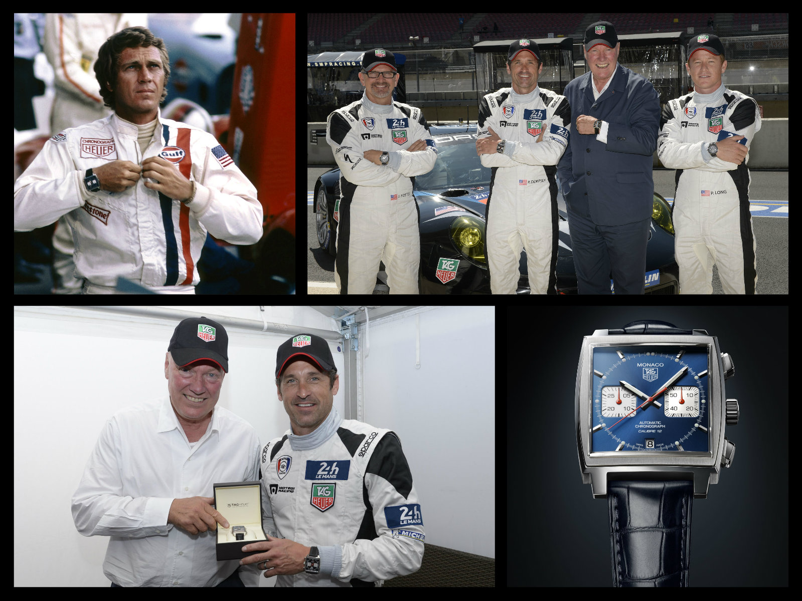 Dall’alto in senso orario: l’attore Steve McQueen nel film Le Mans, il team di Patrick Dempsey con Jean-Claude Biver, Dempsey e Biver, il cronografo Monaco Caliber 12