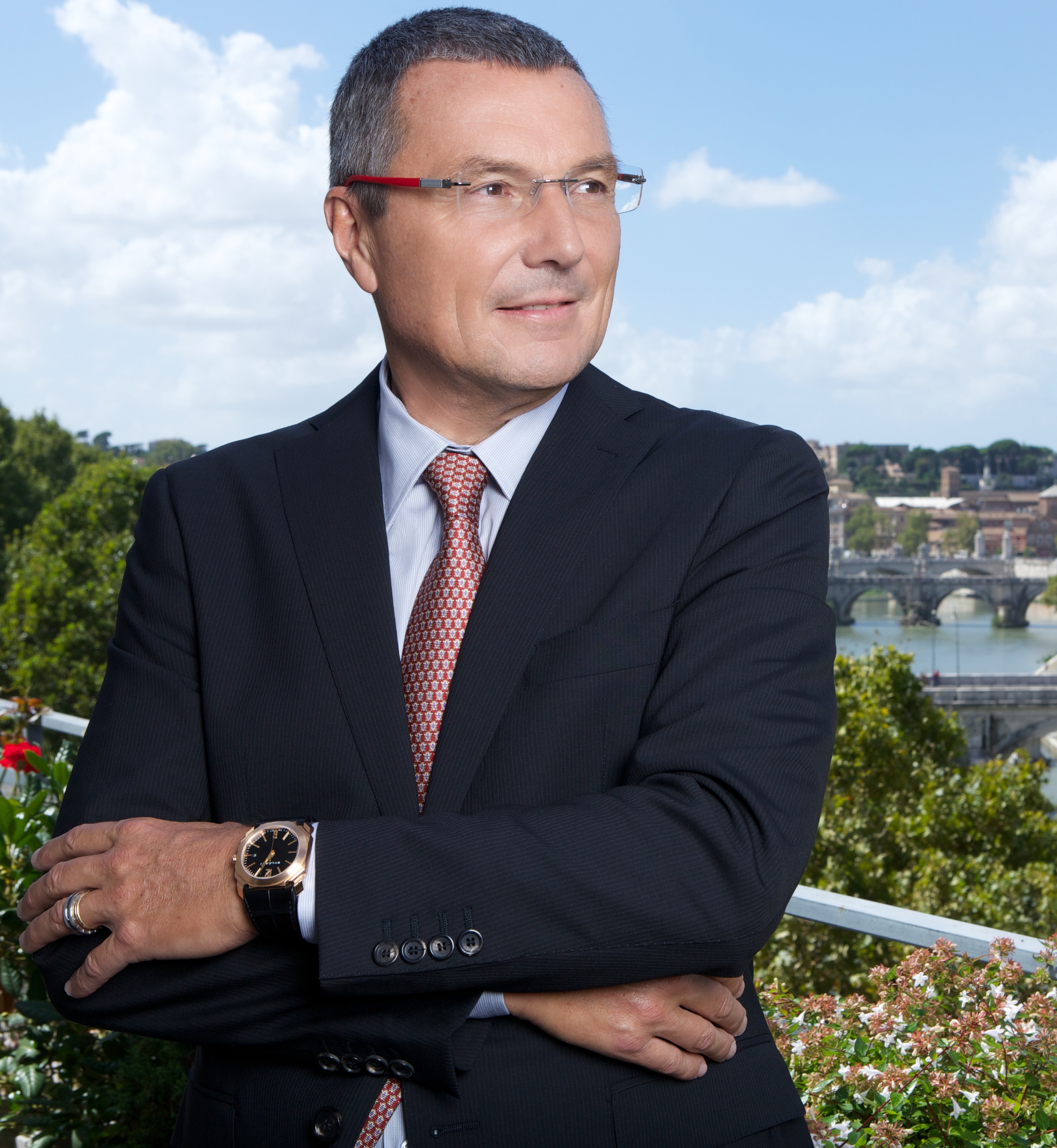 L’ho incontrato poche ore prima nello studio all’ultimo piano dello stand Bvlgari, quello di TAG Heuer è proprio di fronte. Lo conosco da quando arrivò in TAG Heuer e non è cambiato, a parte un po’ di grigio nei capelli sempre corti. Avrei voluto fotografarlo in maniche di camicia di fronte al tavolo-scrivania colmo di carte e di orologi, in un’amosfera molto italiana e poco svizzera. Più consona al ruolo la foto che mi è stata inviata e che lo mostra con lo sfondo del Tevere.