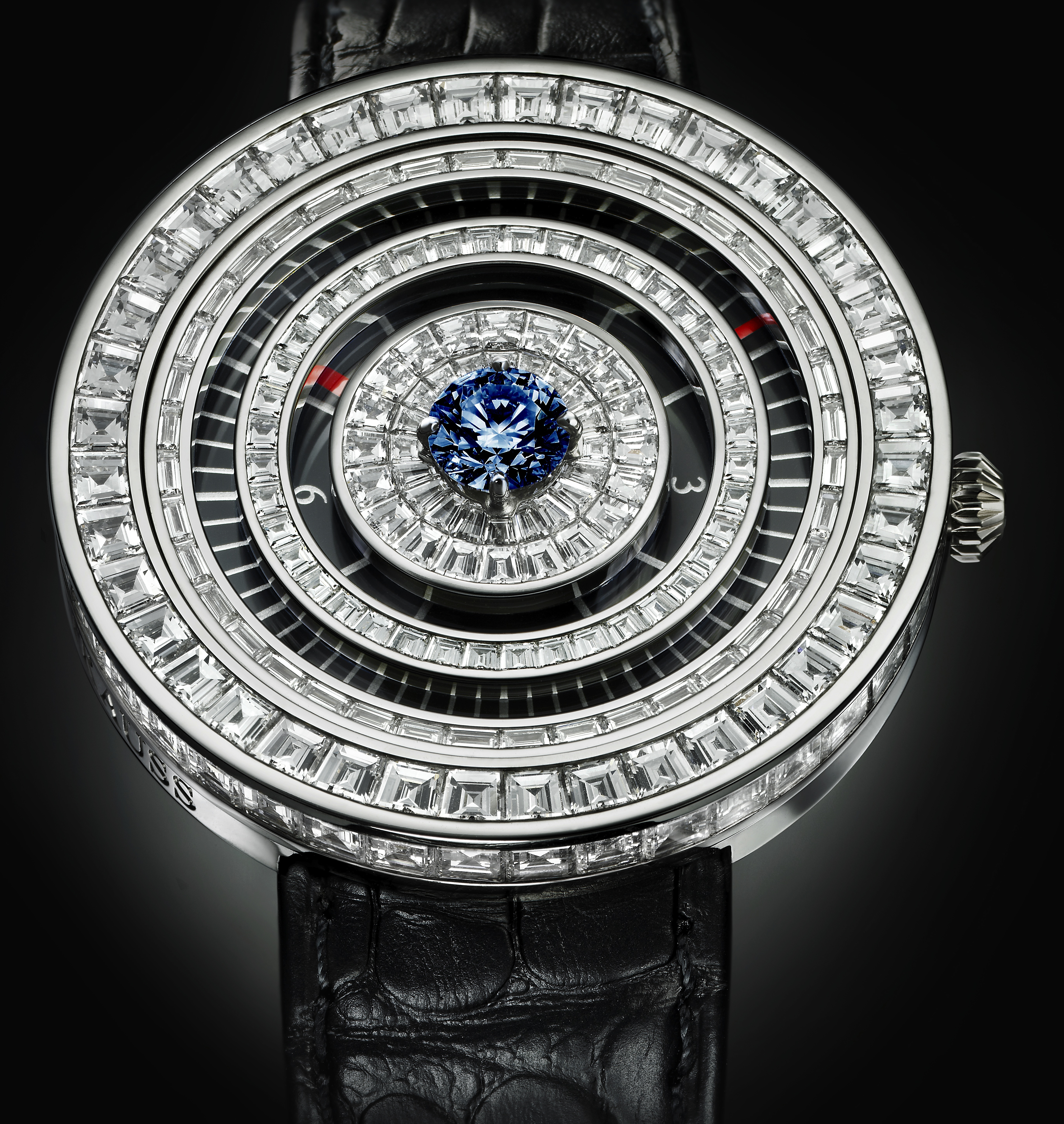 In questa scelta si inserisce la Royal Jester Collection che prende il nome da tradizioni inglesi (il buffone di corte era però anche l’unico che parlava liberamente al Re). Al centro il quadrante ha una pietra preziosa di oltre un carato e diamanti sono incastonati anche sulla carrure. In tanto fulgore ore e minuti sono indicati (discretamente) con dischi in vetro zaffiro. Il movimento meccanico è a carica manuale.