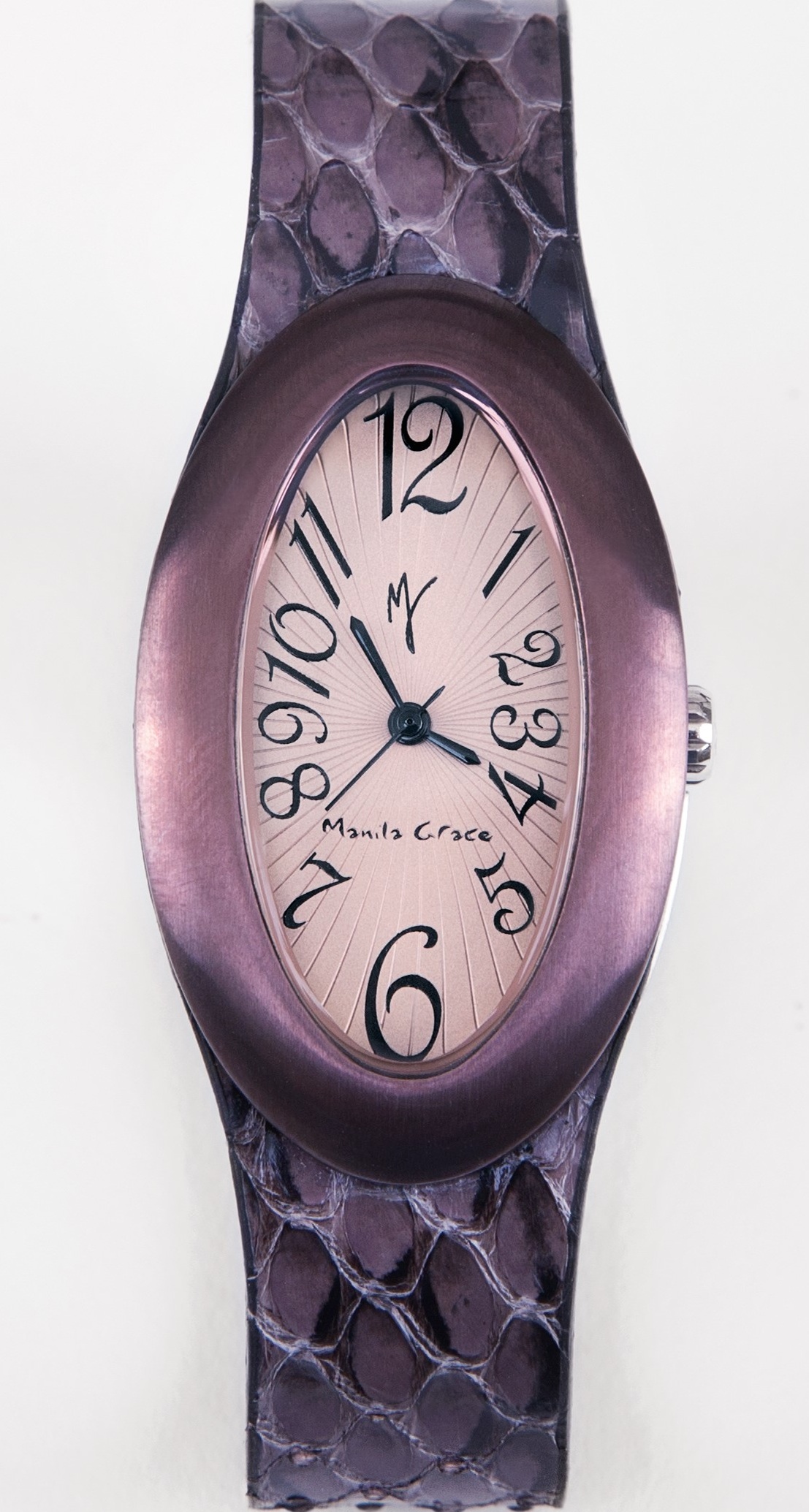 Nel decimo anniversario di Manila Grace, un nuovo brand fashion arriva nel mondo delle lancette con orologi dall’ovale allungato (mm 27×45), cassa in acciaio, lunetta e cinturino in pelle, movimento Miyota, quadranti anche in madreperla con zirconi.