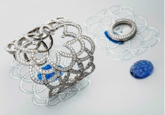 Con questo aneddoto siamo entrati nei segreti di una lavorazione esclusiva e ne presentiamo alcuni passaggi che illustrano l’abilitàdei maestri gioiellieri della Marca. Questo modello, ref.GOA39218, realizzato per la Biennale des Antiquaires di Parigi dello scorso settembre, fa parte della collezione Extremely Piaget, è un orologio segreto celato da uno zaffiro blu (circa 19 carati) inciso a mano. I maestri gioiellieri hanno impiegato 601 diamanti, taglio brillante per circa 16,20 carati, incastonandoli nell’oro bianco