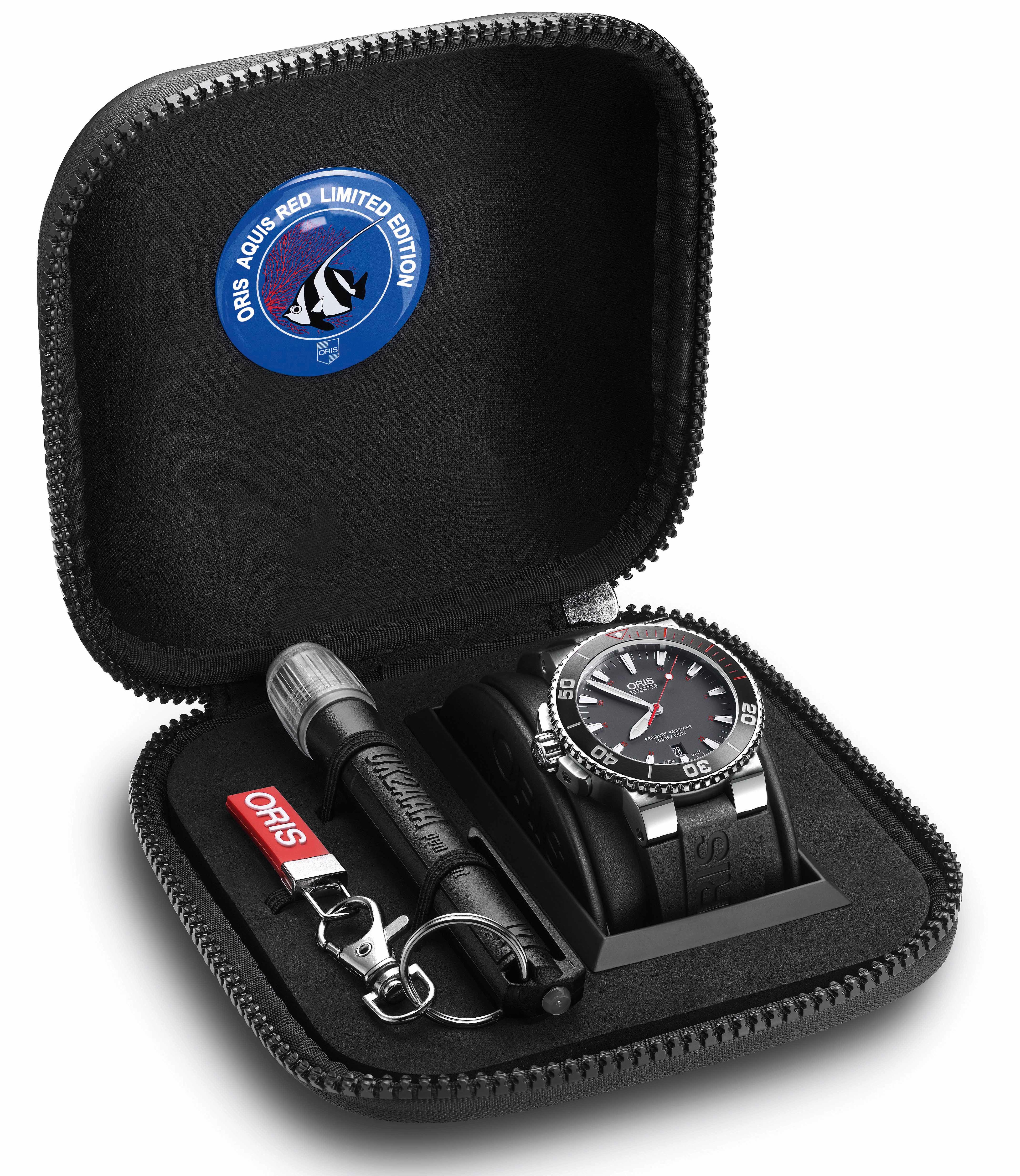 La Marca elvetica, che sostiene stabilmente l’opera del Red Sea Environmental Centre, ha realizzato 2000 esemplari di un orologio subacqueo a 300 metri con la cassa ø 43 mm in acciaio inox, lunetta girevole unidirezionale con inserto in ceramica nera, scala dei minuti in bianco e rosso, corona protetta, fibbia scorrevole e ancoraggio di sicurezza alla muta. Il movimento automatico è il Calibro Oris 733, su base Sellita SW 200-1. Sul fondello il logo del Centro e la dicitura Oris Aquis Red Limited Edition. Nell’originale confezione, oltre all’orologio, anche un’utile torcia impermeabile.