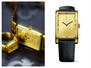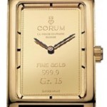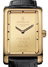 Patek Philippe e Piaget fecero orologi-moneta sin dagli anni ’50-60, anche Corum usò in quel periodo il dollaro americano, ma forse è stata la prima a impiegare un lingotto d’oro. Fu un fabbricante di casse a suggerire al Management di Corum l’idea di usufruire di un lingotto nel quale inserire il movimento; in seguito si preferì usare i lingotti come quadranti, con un foro per le lancette. La fonderia ufficiale delle Banche svizzere ne attestava l’originalità e il peso (15 g), il movimento impiegato fu un Fréderic Piguet ultrapiatto, cal.9,21. Corum scelse anche lingotti da 2,5 , 5 e 10 grammi e li utilizzò per orologi con movimenti al quarzo. Il metallo era oro fino 999,9/1000 o platino puro 999/1000 che partiva dal peso di 5 grammi. Alla Fiera di Basilea fu esposto anche un modello molto prezioso, quadrante in platino fino e cassa in platino 950/1000.