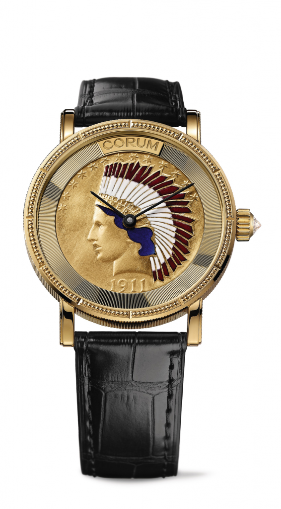 Gold money also on watch’s dial; Corum, Piaget and other brands followed in the past this idea, using gold money for cases; in Baselworld 2014 Corum presented a new Lingotto (the first was born in 1977) and the Indian Head.