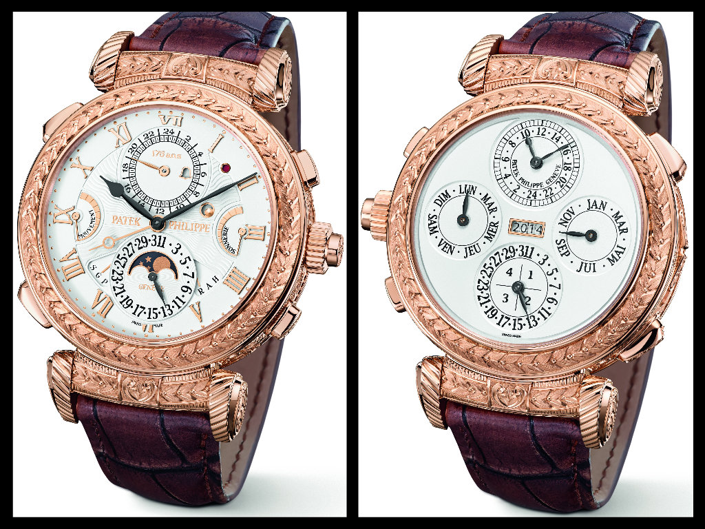 L’orologio dell’Anniversario è il Grand Master Chime, Referenza 5175, chiamato anche “Calibro 300”; un eccezionale orologio da polso duo-face, ricco di 20 complicazioni, due delle quali inedite ed esclusive di Patek Philippe (sei i brevetti): Grande et petite sonerie, ripetizione minuti, cinque suonerie, Q.P. quadriennio, fasi di luna, secondo fuso orario, indicazione notte/giorno, riserva di carica, data e alarm con la melodia della ripetizione minuti. I componenti sono 1366; il peso è di circa 200 gr. gli esemplari sono sette, uno resterà nel Museo Patek Philippe);