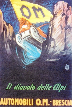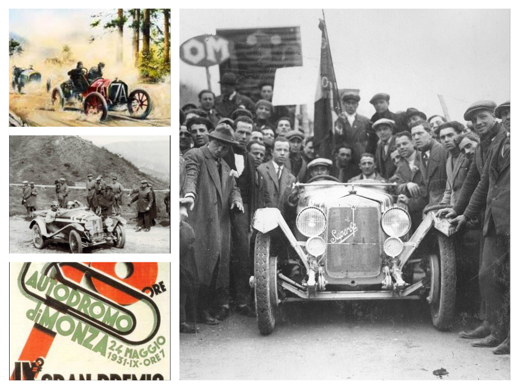 Nando Minoia vittorioso su OM e in gara; a lato disegni d’epoca, la locandina di un Gran Premio a Monza e, in alto, il manifesto OM per la Coppa delle Alpi vinta da Minoia nel 1924 su OM 2000