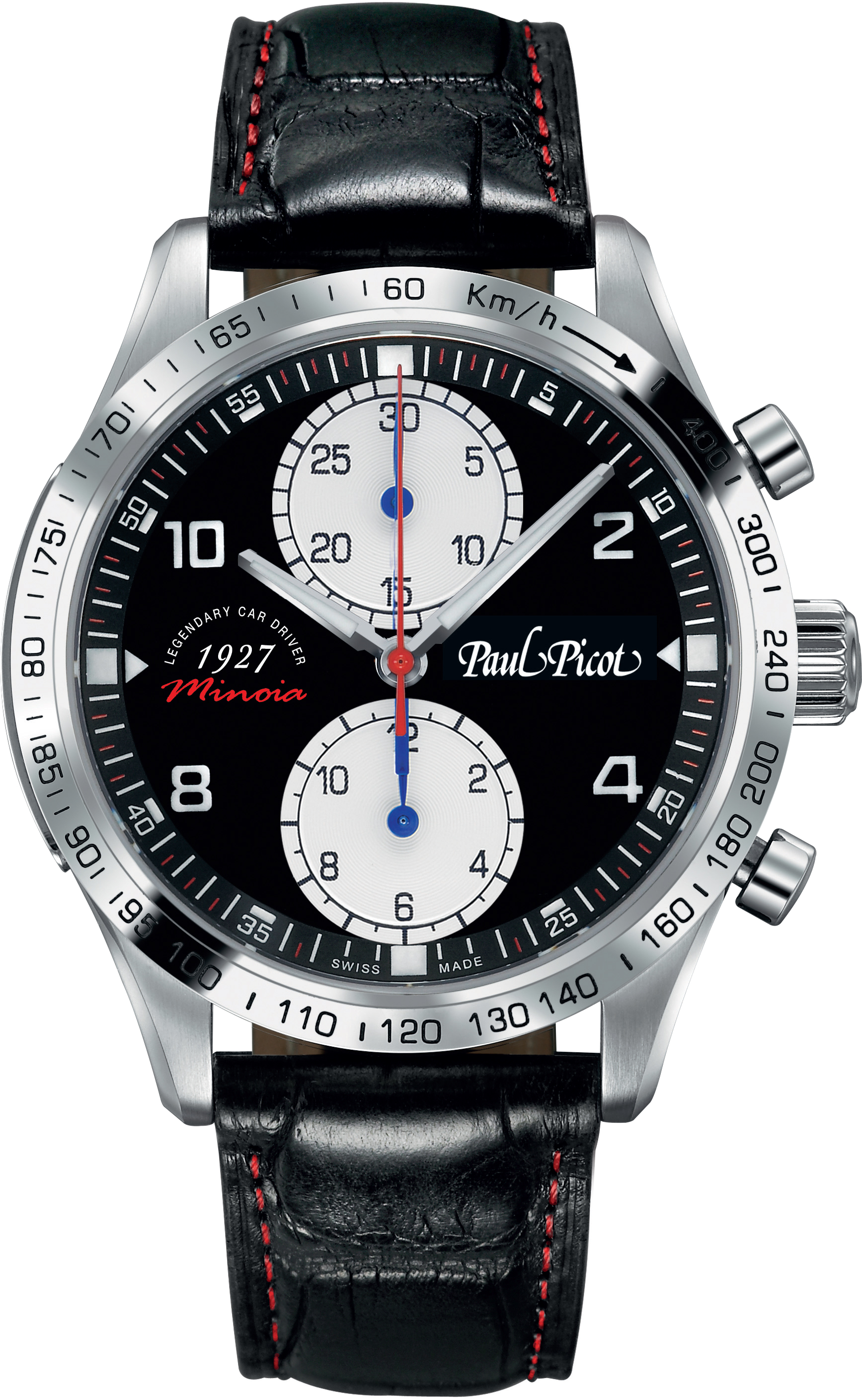 Paul Picot aveva scelto di dedicare un cronografo a Morandi, anche perché spesso il co-pilota o navigatore non viene ricordato a dovere, ma avendo fatto questa scelta e visto il successo del segnatempo, si imponeva – è il caso di dirlo – un identico omaggio al pilota. Ed ecco in 100 esemplari numerati il nuovo cronografo automatico della collezione Gentleman, dedicato a Nando Minoia, con cassa in acciaio ø 42 mm, quadrante nero con contatori ispirati a quelli della OM, a ore 9 in rosso il nome e la data della prima Mille Miglia. A differenza di quello dedicato a Morandi ha la lunetta che reca incisa la scala tachimetrica.