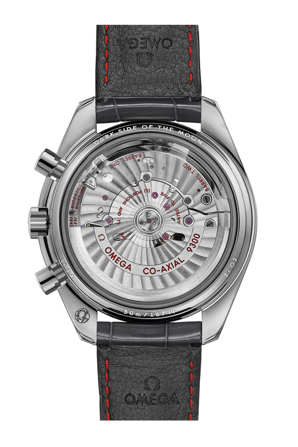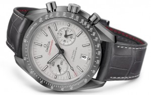 Per orientarsi nell’ampia famiglia Speedmaster, il nome completo di questo modello è Grey Side of the Moon, inciso anche sul fondello, una licenza poetica che fa pensare anche al lato B. del pianeta. Il grigio si riallaccia alla polvere lunare, forse più bianca, e alle proprietà della ceramica, che dopo tre ore in forno al plasma a 20.000°, assume un colore grigio metallizzato, appunto quello della cassa. Sulla lunetta in ceramica spazzolata la scala tachimetrica è trattata Superluminova. Anche corona, pulsanti e fibbia sono in ceramica. Il trattamento Superluminova rende più visibili indici e lancette, quella dei secondi cronografici si distingue per il rosso della punta. In quanto al quadrante è in platino 950 sabbiato e sono in platino anche i due contatori cronografici (quello di ore e minuti è alle 3). Infine dal fondello in vetro zaffiro si vede il movimento: Co-Axial calibre 9300 (dicitura impressa anche sul cinturino in pelle con inserti in caucciù nei punti di maggior usura) dotato di spirale in silicio Si14.