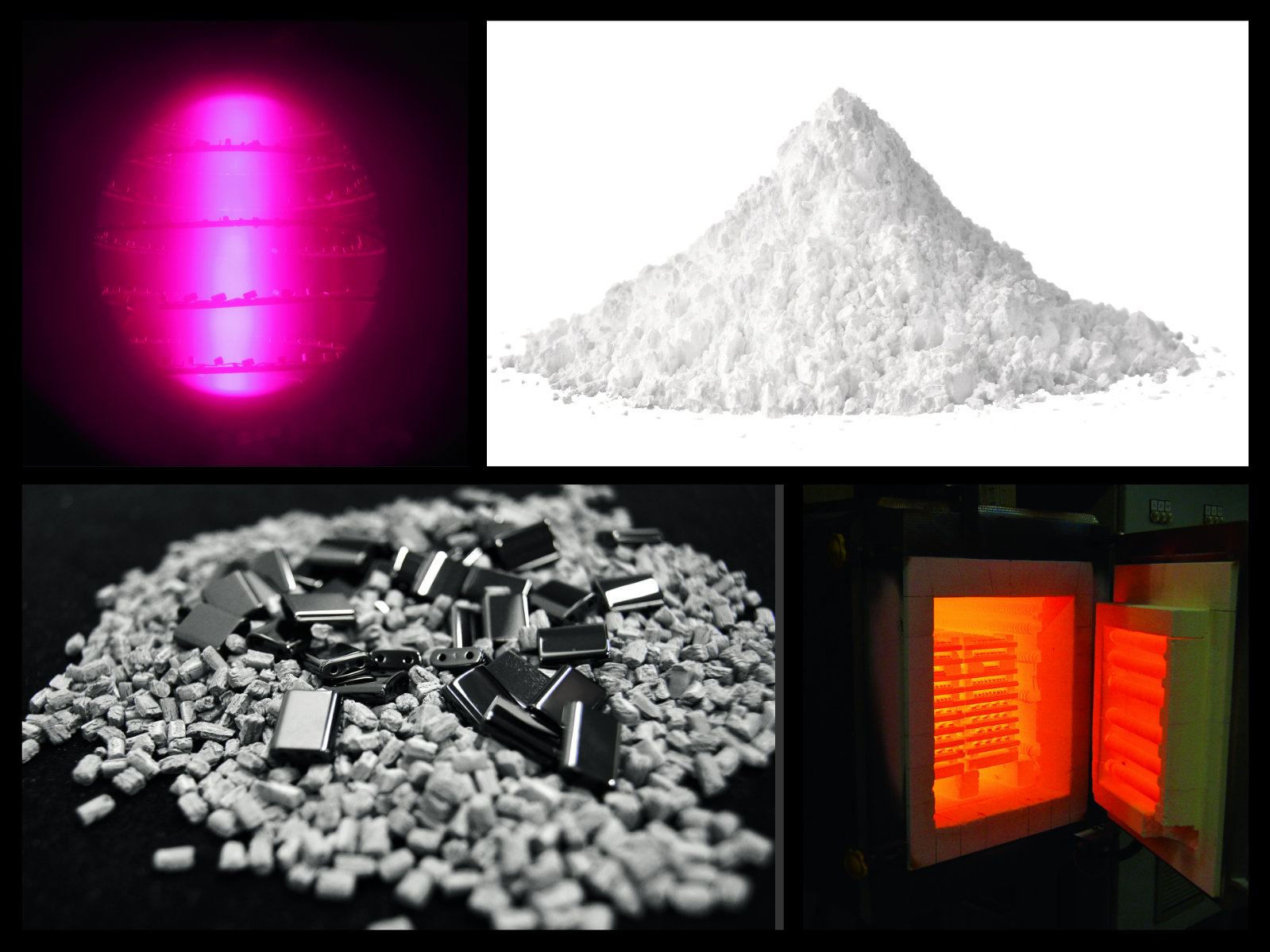 Rado la materia prima in polvere; i forni per la cottura al plasma e la sinterizzazione; il prodotto sinterizzato prima e dopo la lucidatura