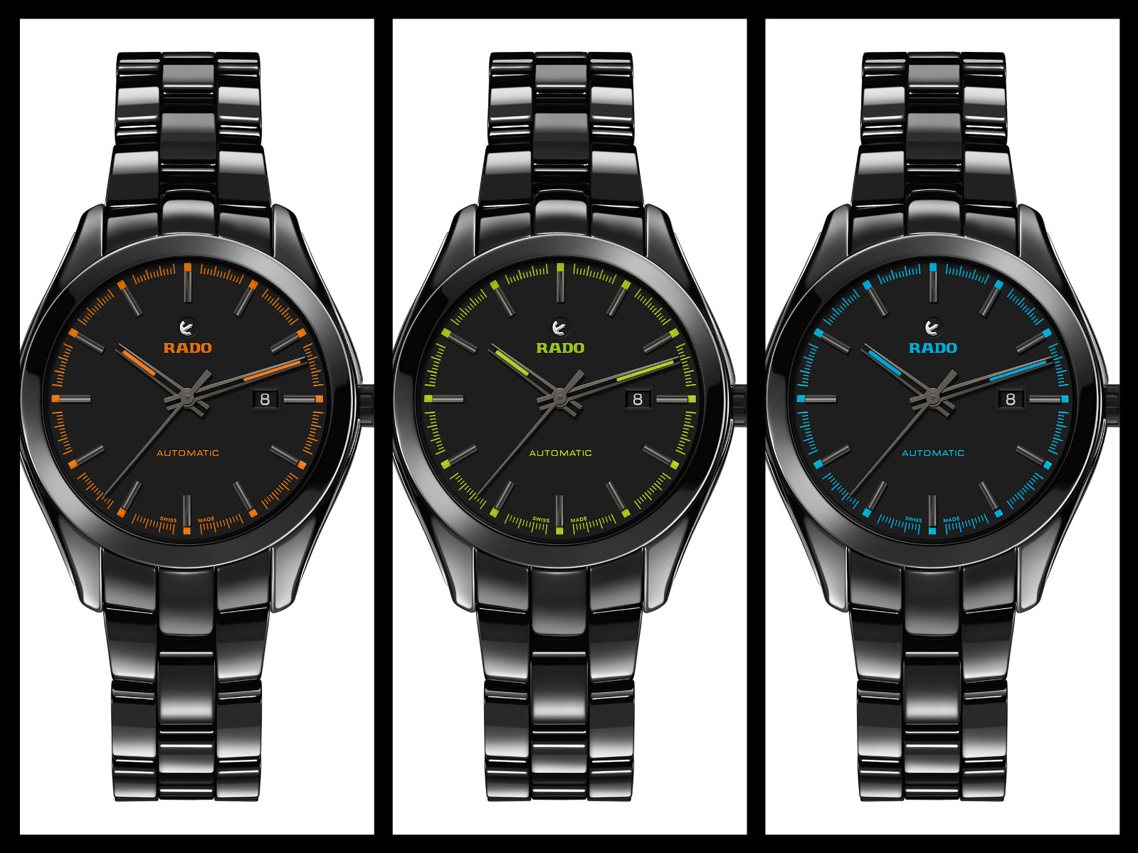 Completano le novità Rado 2014 altre due collezioni. L’Hyperchrome Ceramic Touch è composta da orologi maschili Dual Time con sei sensori sulla cassa per regolare il doppio fuso con intervalli minimi di 15 minuti, cassa e bracciale grigio o nero anche mat oppure bianco. L’Hypercrhome Court Collection invece ha il movimento automatico ETA 2681, sui quadranti loghi, scritta e lancette in arancio, blu e verde.