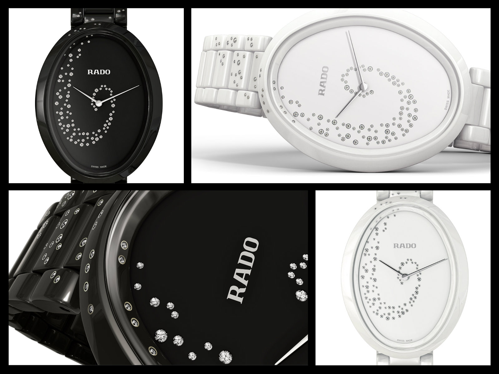Nella lavorazione di questi Rado Essenza Ceramic impreziositi con diamanti, e in quelli che fanno parte della collezione Fibonacci Colours, si è arrivati a incastonare le pietre direttamente nella ceramica, alloggiandole singolarmente nel platino nei fori ottenuti con il laser, realizzando inoltre con grande maestrìa disegni che si sviluppano non solo sul quadrante, ma anche sulle maglie del bracciale. Il nome Fibonacci è stato dato per l’armonica disegno colorato, particolarità che si rileva anche nelle piante; solo 300 gli esemplari per ogni tipo di pietra.