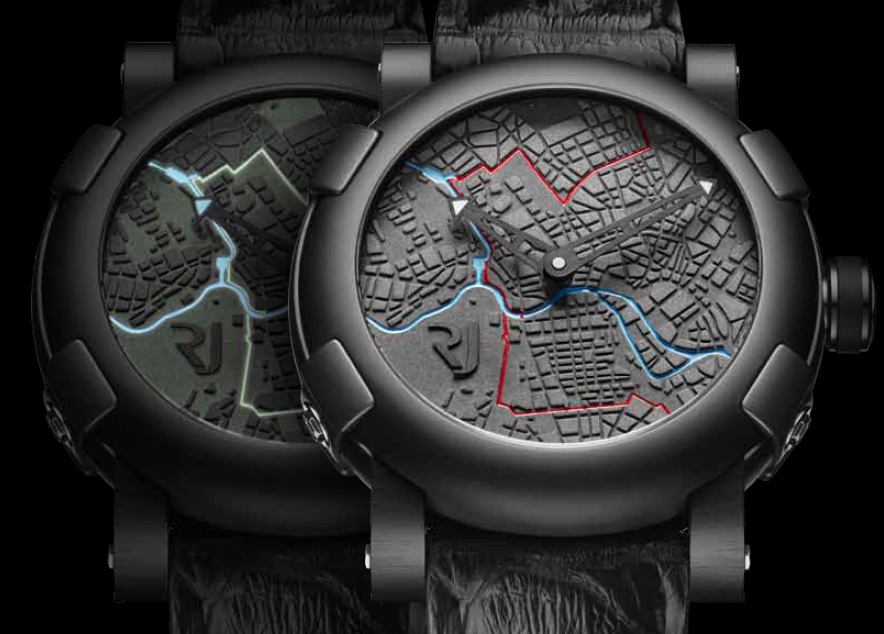 25 yeas after the end of Iron Curtain and Berlin wall fall, Romain Jerome has a new self-winding watch, black PVD coated steel case ø 46 mm, with some fragments of the wall in the cement dial showing a map of the town: in red the wall, in blu the river; Superluminova allows to see in the dark wall and river. on the back Brezhnev and Honnecker.
