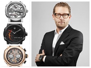 Manuel Emch e un modello che si riallaccia agli squelette, il quadrante con la lava del vulcano islandese Eyjafjallajokull e quello di un cronografo Steampunkt che identifica RJ con grandi indici