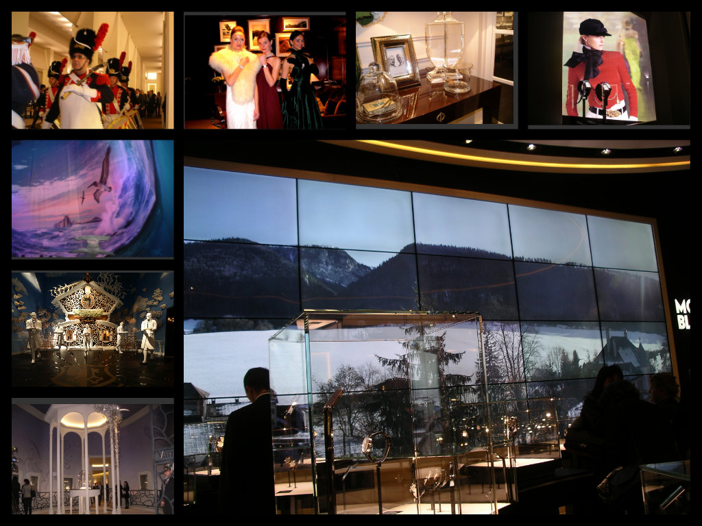 IWC dedica il 2014 agli Aquatimer e all’impegno per la salvagurdia delle Galapagos, sembra di entrare nel mondo subacqueo sotto una pioggia di luci; Lange & Sohene ha sostituito il monumentale orologio da polso del 2013 con il nuovo Terra Luna. Il cucù di Roger Dubuis ha una monumentale casetta e manichini per le novità. Sotto un cielo stellato un gazebo ospita il Q.P. di Van Cleef&Arpels. Eleganti mannequins ingioiellate da Cartier; da Baume & Mercier all’ingresso un tavolino (nelle cornici le foto sono quelle di Baume et Mercier); Panerai ha allestito una parete a biblioteca con libri sugli scaffali e, al centro, il nuovo pendolo da tavolo. Da Montblanc e Audemars Piguet lo sfondo è una finestra con gigantografie ruotanti di Le Locle/Villeret e Le Brassus; ancora mannequins e vetrine a tema da Ralf Lauren con il mondo dei cavalli.