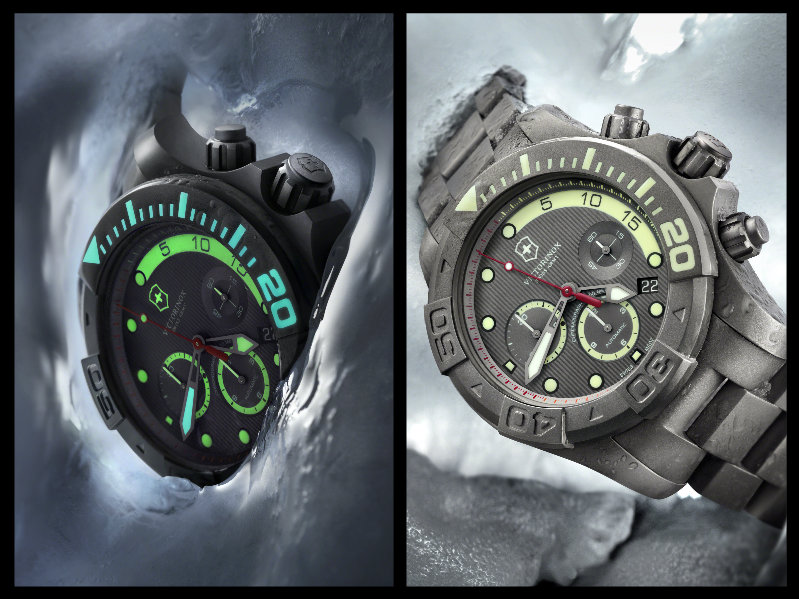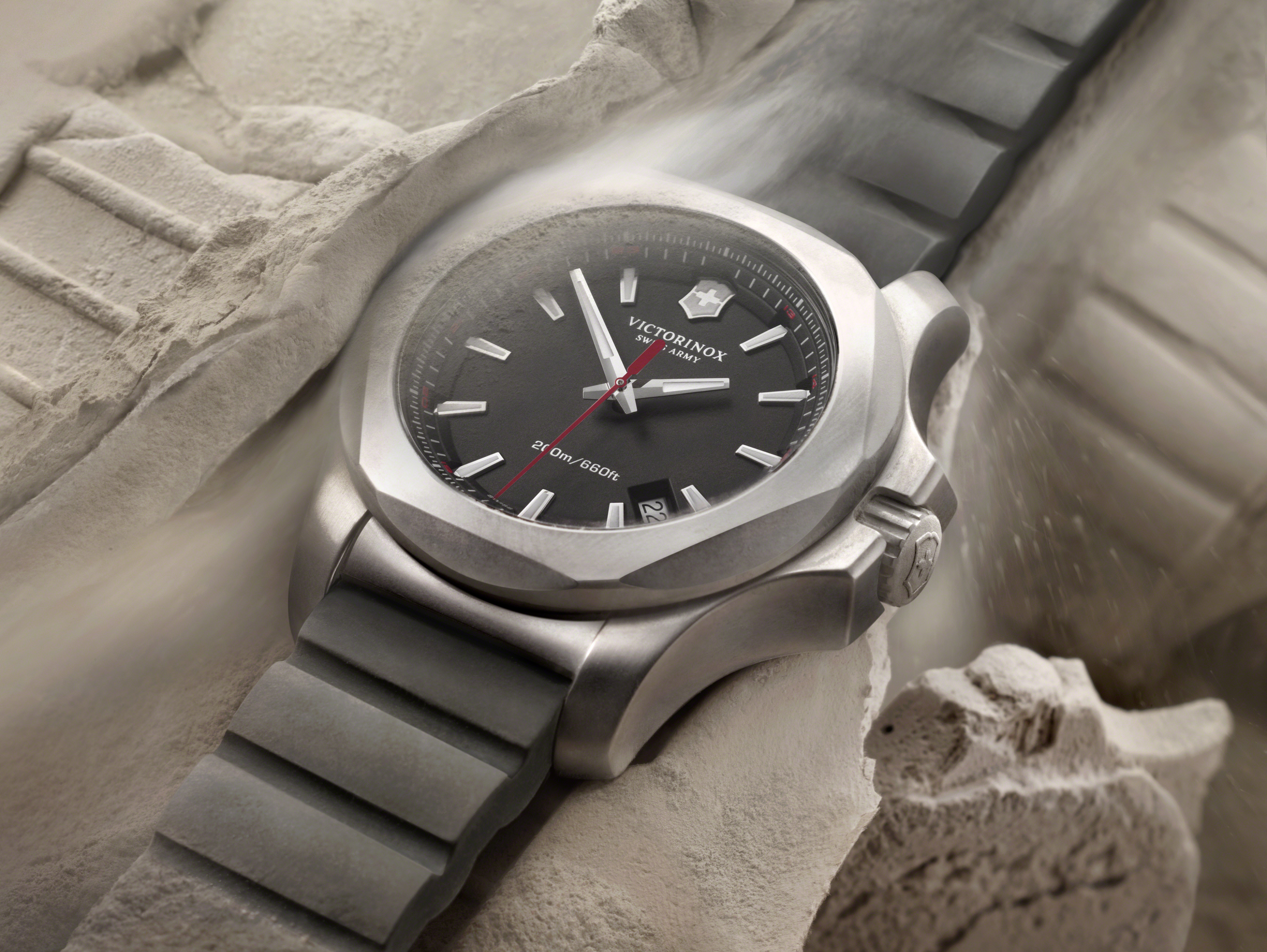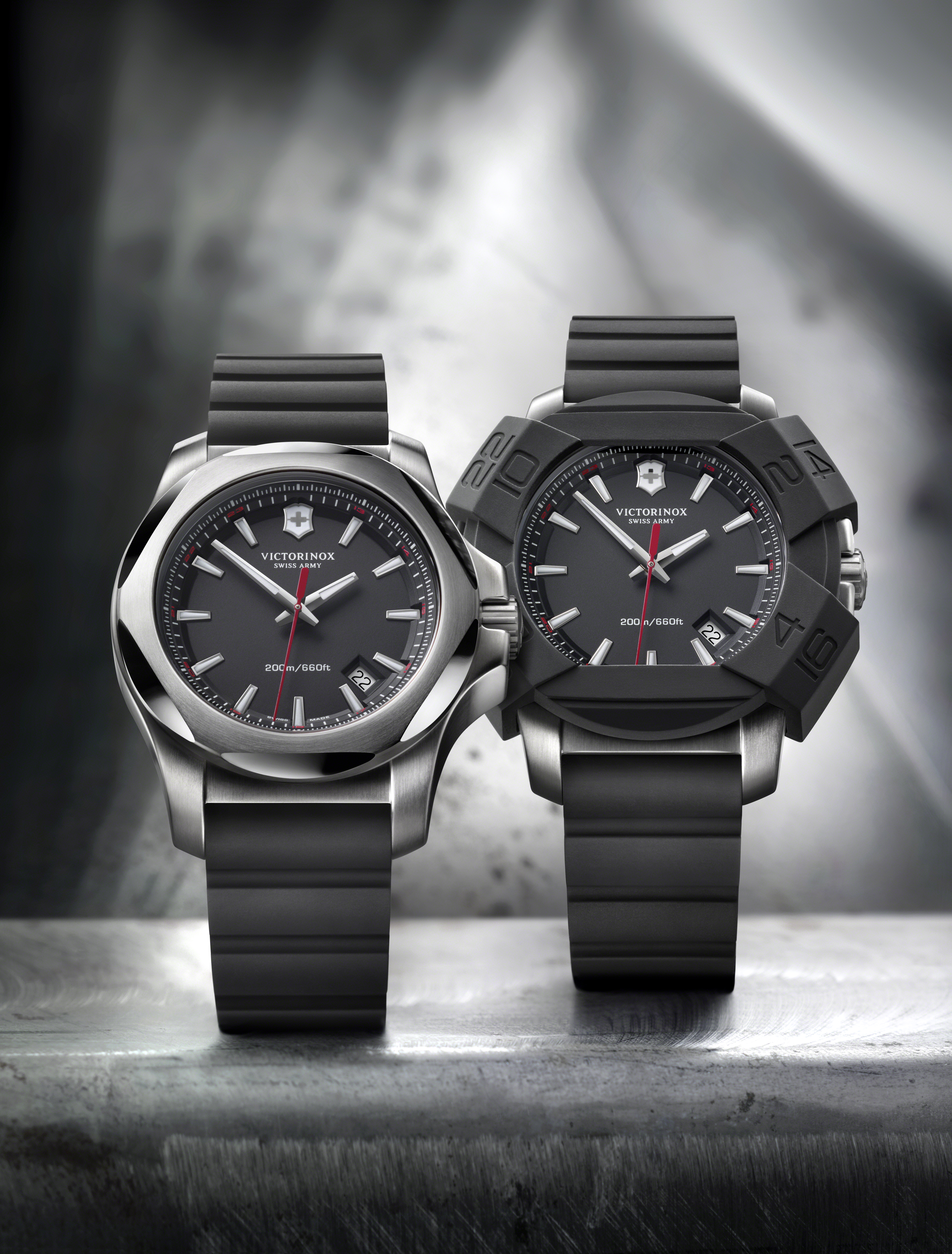 Per il doppio anniversario dunque era logico che Victorinox Swiss Army preparasse non uno, ma due orologi. Quello per il marchio centenario riprende nel nome la filosofia dell’azienda, si chiama Inox; ha superato 130 test che ne hanno verificato la solidità, dalla caduta da dieci metri al peso di 64 tonnellate, a due ore in lavatrice o in una tempesta di sabbia e altro. Impermeabile a 200 metri ha la cassa e le anse rinforzate, gli indici incisi e dispone anche di una protezione rimovibile in silicone e nylon. Da settembre nei negozi, si può sceglierlo in tre varianti di colore: nero, verde khaki, blu marine; il movimento è al quarzo svizzero.