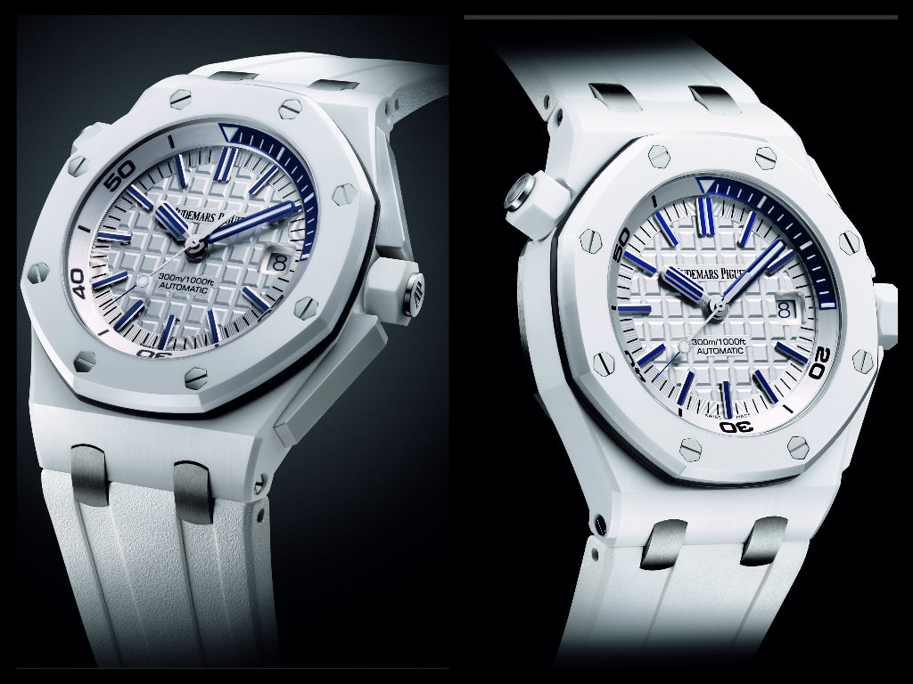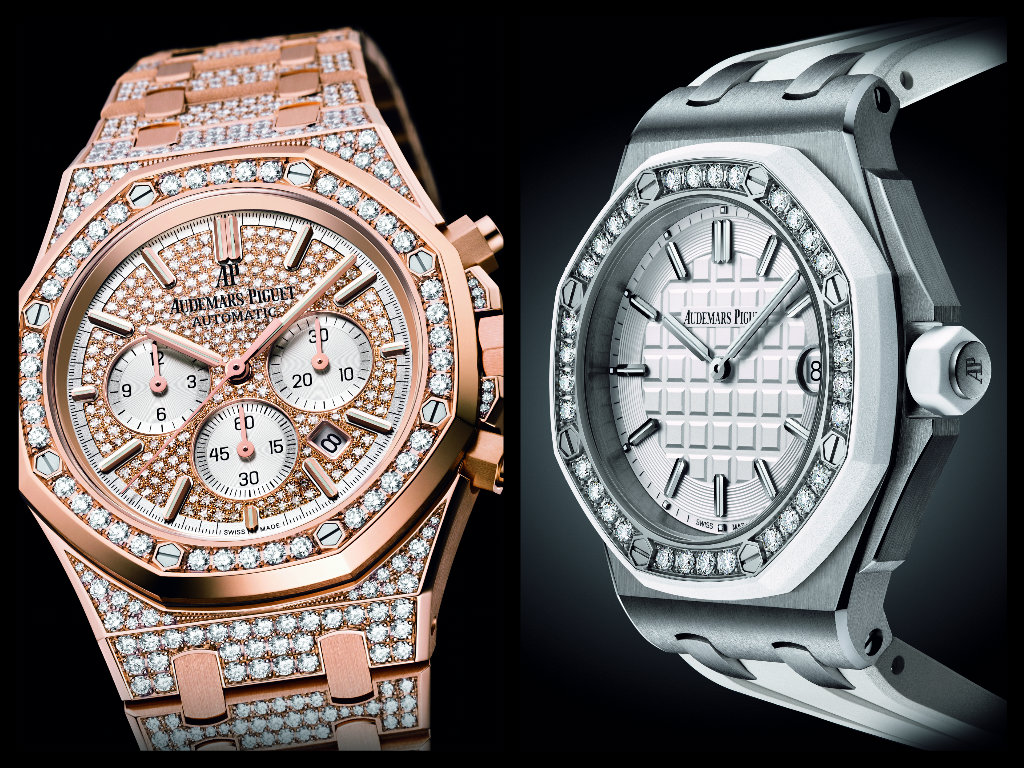 Il primo orologio da donna Audemars Piguet lo realizzò nel 1883, nel secolo scorso un capolavoro è stato il piccolo Carillon Dame e per il Royal Oak Lady si può quasi parlare di Eva nata dalla costola di Adamo, anche se agli inizi era molto “gioiello” con movimento al quarzo e bracciale in metallo. Il Royal Oak Offshore ha seguito questa strada e nel 2014 propone per le signore un mm 37 in acciaio con lunetta in brillanti e movimento al quarzo e, con cassa 41 mm in oro rosa, un cronografo (anche troppi i diamanti) e un automatico con brillanti sulla lunetta e movimento di Manifattura .