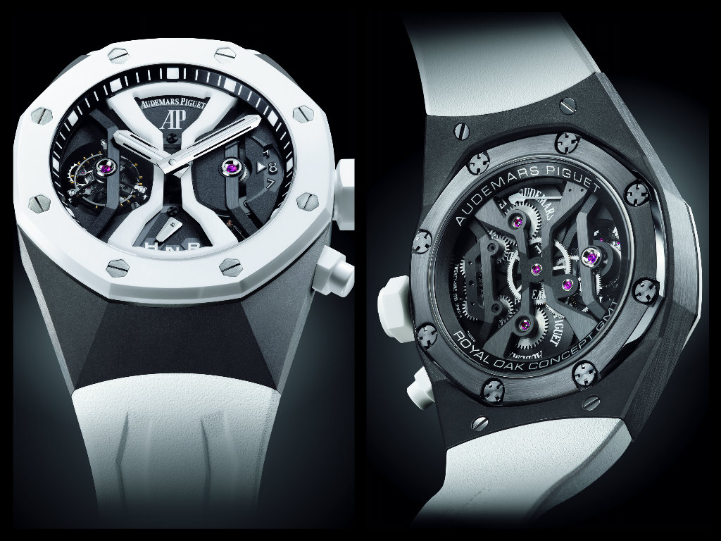 Royal Oak Offshore Concept GMT Tourbillon: inedita la costruzione del movimento con ponte in ceramica bianca come la cassa (ø 44 mm), la corona, la lunetta e i pulsanti; la carrure invece è in titanio
